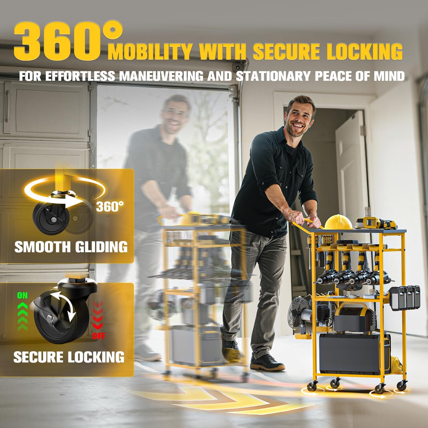 - Workflow Freedom: Equipped with 360° smooth-rolling casters, this power tool organizer cart turns your static storage into a mobile workstation. Effortlessly transport heavy tools organizers and storage between the garage, workshop, and outdoor project sites. This complete tool organizer system eliminates repeated unloading hassles, keeping all your power tools organizer secure and making your workflow smoother