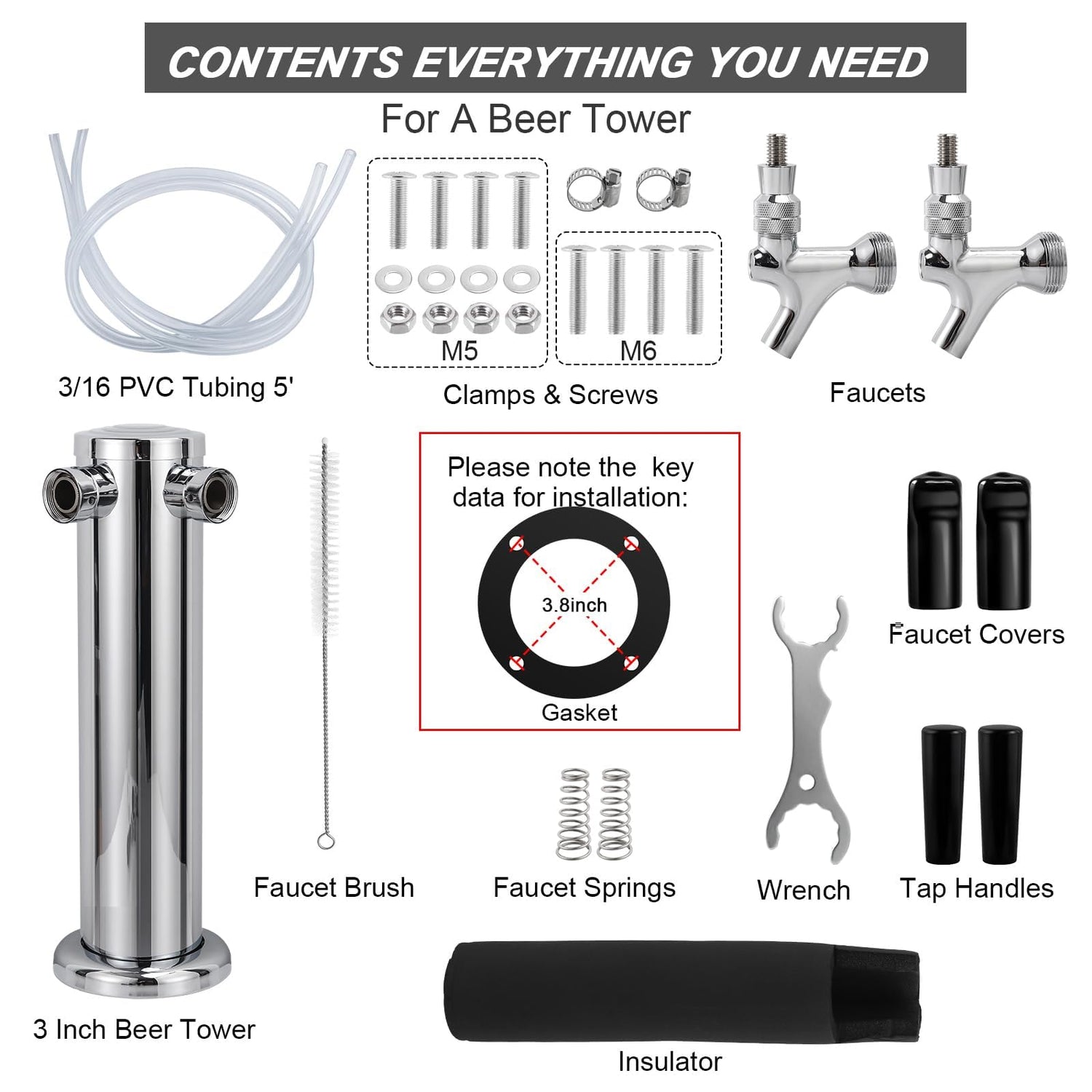 - Contents Everything You Need For A Beer Tower: Comes with 1 stainless steel column, 2 brass faucets, 2 of 5 feet 3/16" I.D. tubing, 1 beer tower gasket, 4 sets of M5 screws and nuts, 2 clamps, 2 beer faucet springs, 2 beer faucet soothers, 1 beer tap wrench, and 1 cleaning brush. A complete beer dispenser tower.
