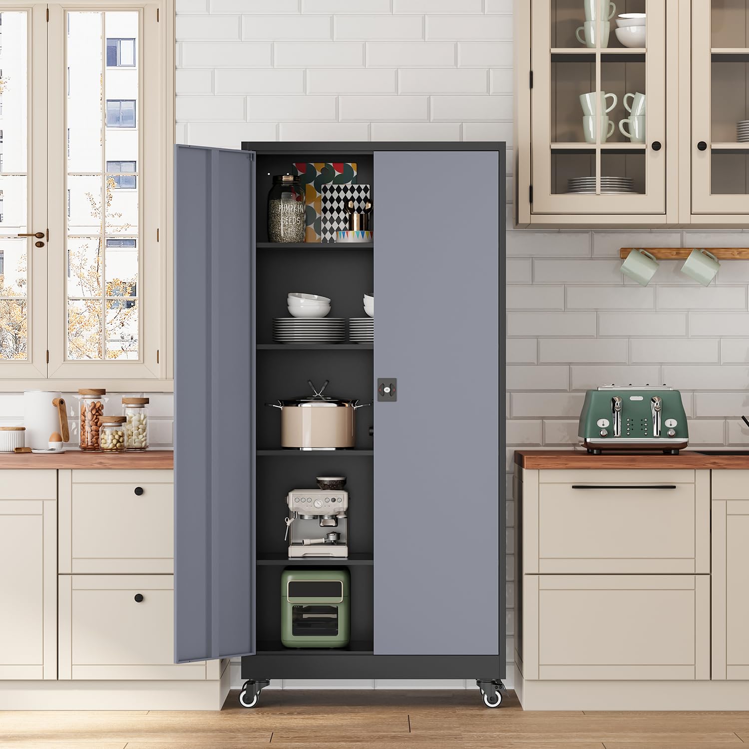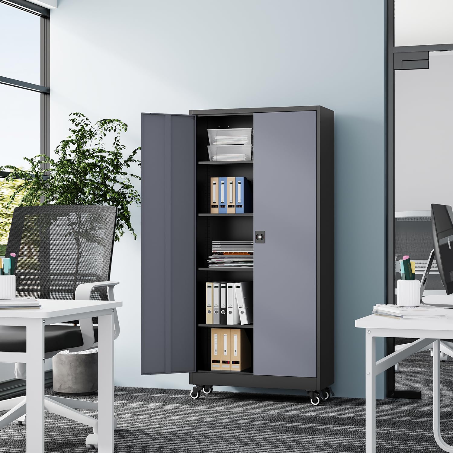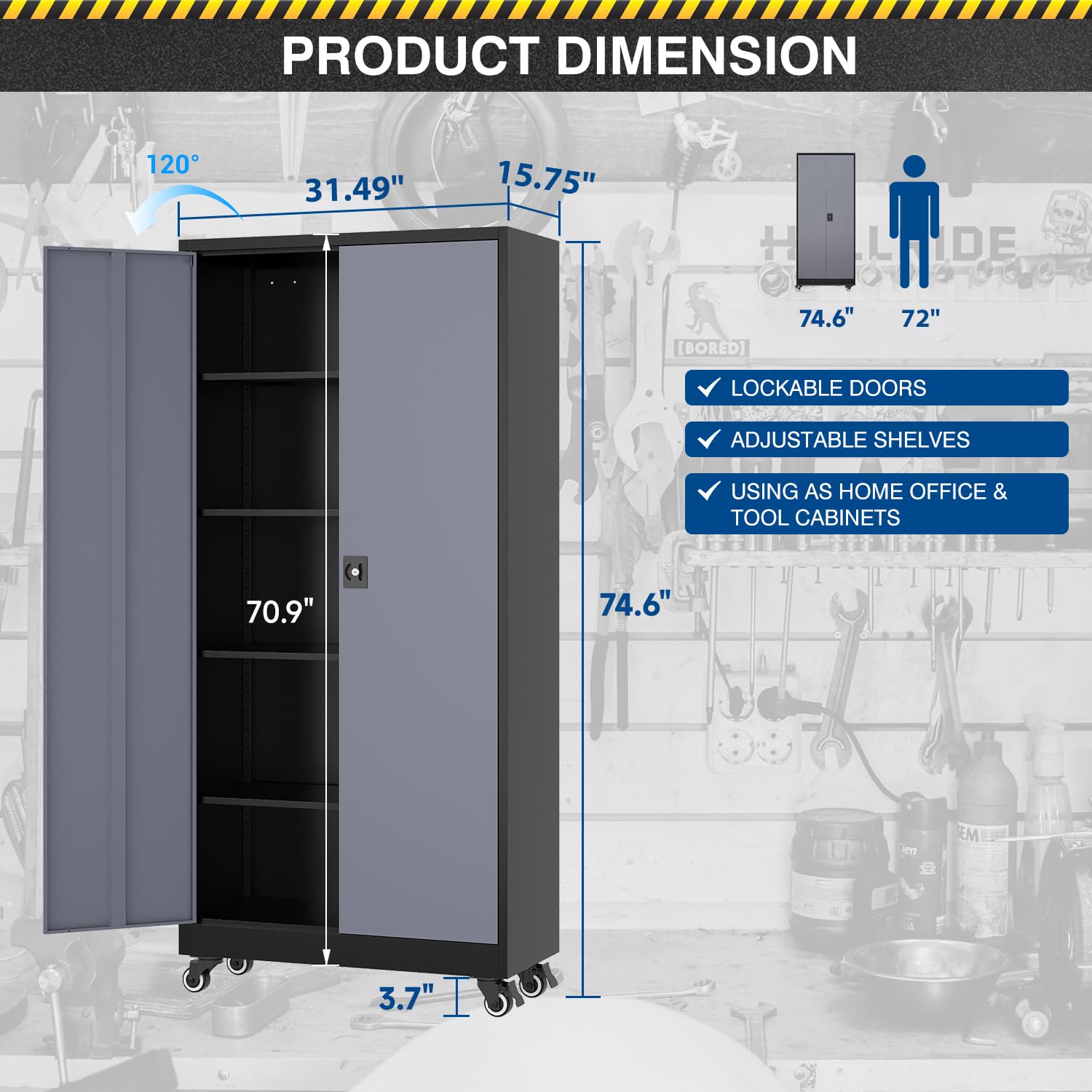 Fesbos Metal Rolling Storage Cabinet-74.6” Tall Steel File Cabinets with Wheels Lockable Doors and Adjustable Shelves-Black & Gray Steel Storage Cabinet for Home, School, Office, Garage