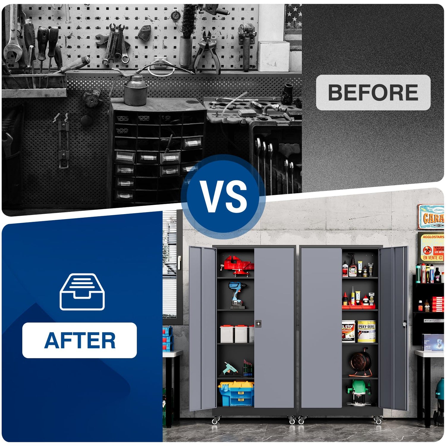 - Locking & Wheeled Storage Cabinet- The storage cabinet has 2 hinged doors, with full-length welded reinforcements to increase strength, Four metal bracket wheels (two of which have independent brakes) can bear more weight while also allowing the cabinet to be moved easily, and a three-point locking rotating handle to ensure safety. 2 keys included, which can be used by co-owners or as a backup in case of loss.