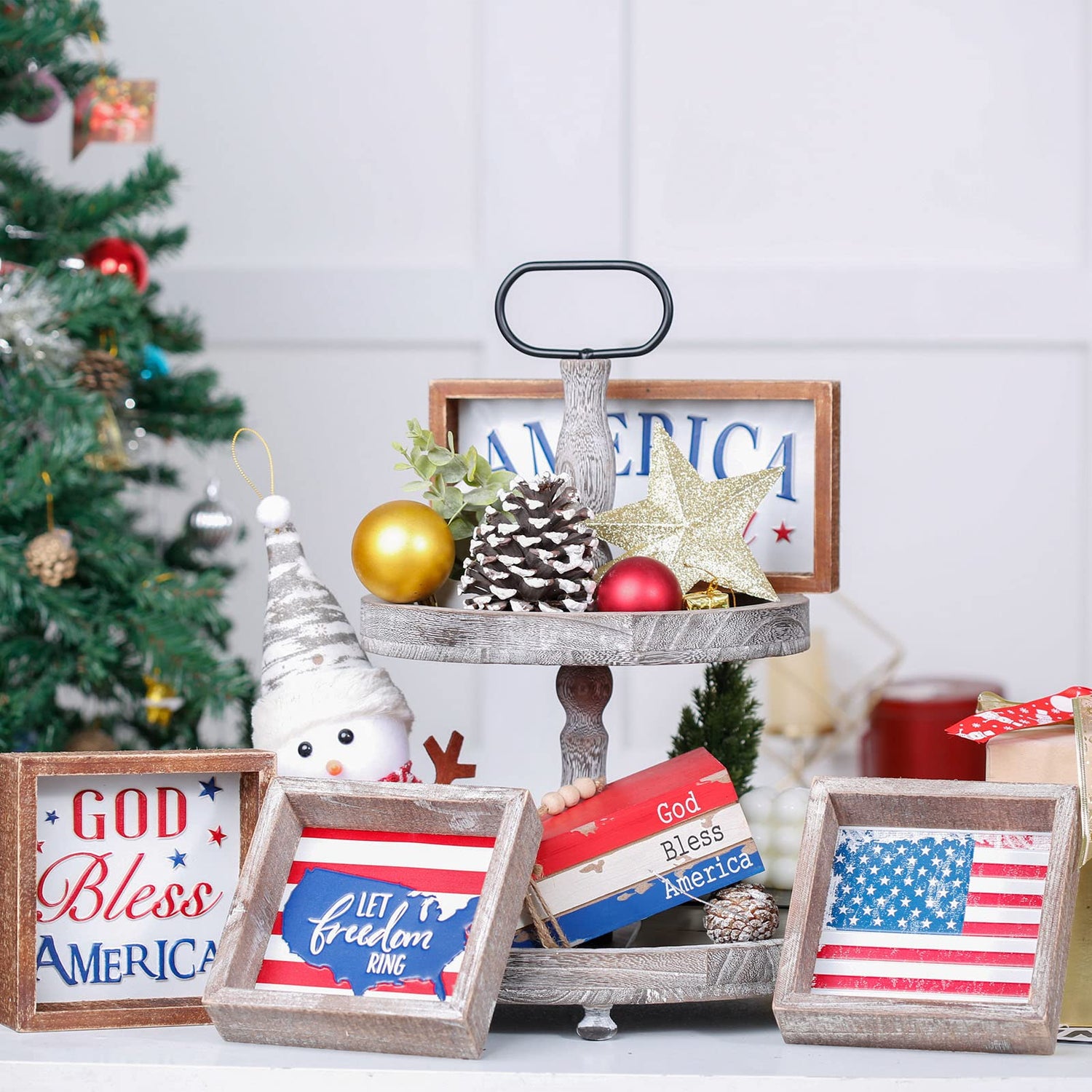 FESTWIND 4th of July Tiered Tray Decor, Wood Frame Embossed Metal USA Flag Block Sign, American Flag Table Decor for Fourth of July, Memorial Day, Patriotic Wood Decor for Shelves