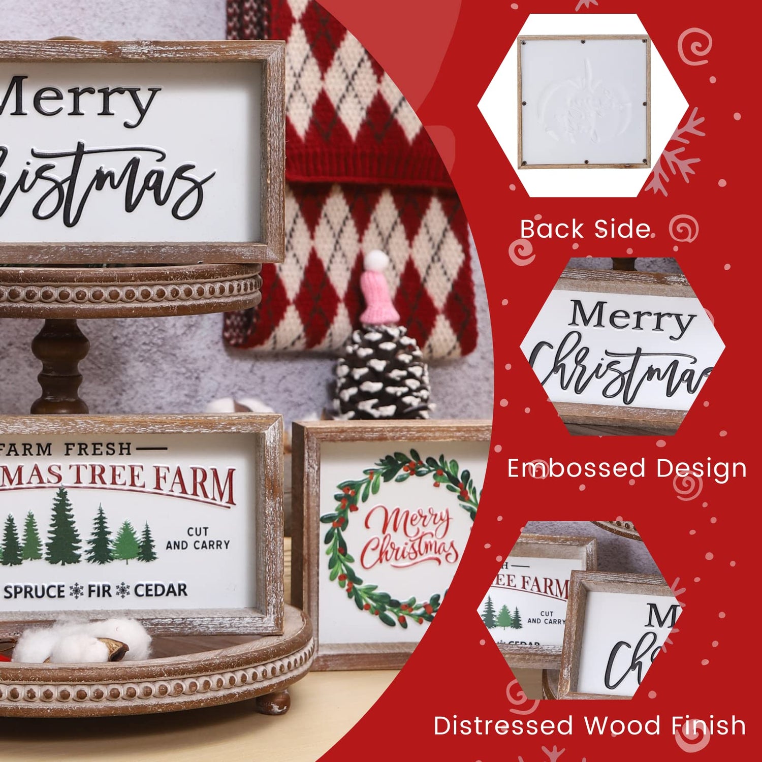 FESTWIND Christmas Tiered Tray Decor, Merry Christmas Block Sign Embossed Metal With Wood Frame - Shelf, Mantel, Home Decor - Rustic Farmhouse Christmas Decoration