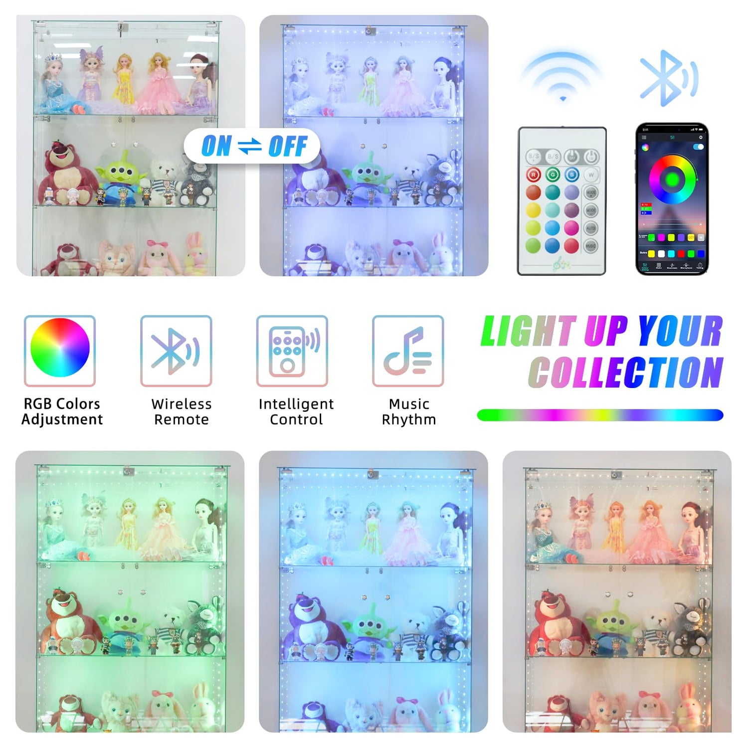 - INTELLIGENT CONTROL OF LIGHTING: This smart LED display cabinet has built-in high-quality light strips, and the lights can flash and change with the rhythm of music, creating an immersive visual feast. Supports mobile phone APP remote control, easily switch lighting modes, and let your collection show its unique charm under different lights.