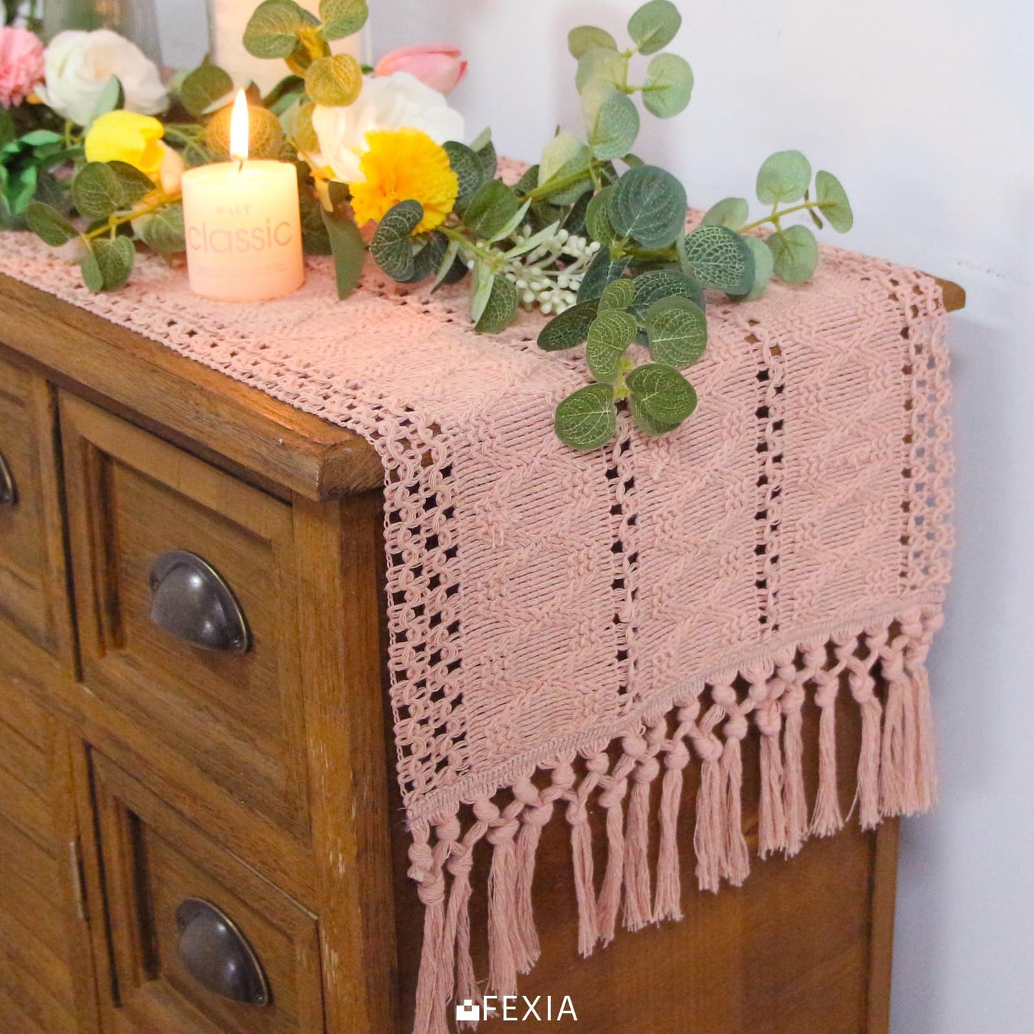 FEXIA Pink Table Runner 72 Inches Long Boho Macrame Table Runner for Summer Pink Room Decor Farmhouse Table Runner with Tassels for Dining Bedroom Decor Rustic Bridal Shower (12x72 Inches)