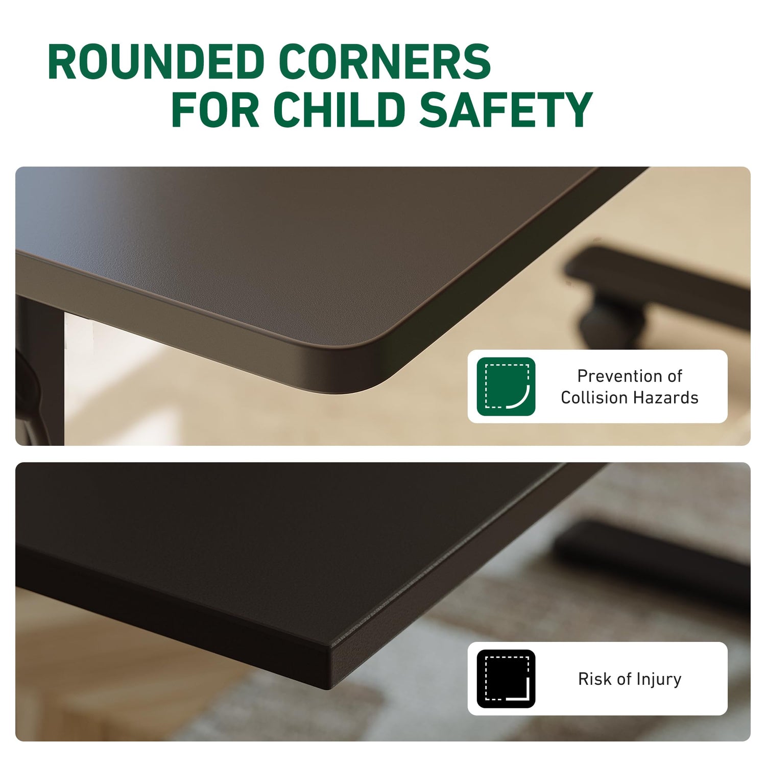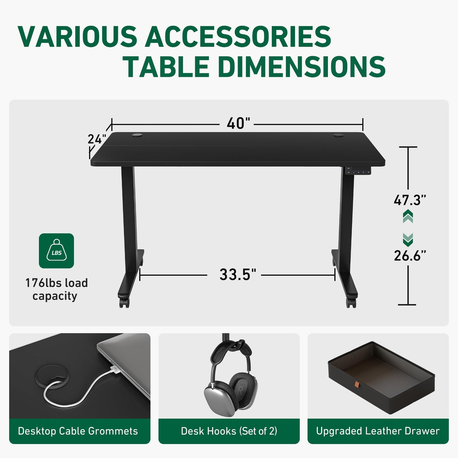 - Various Accessories:In consideration of your daily needs, the electirc desk comes with 2 hooks and 4 casters.The desktop cable grommets help you organize and sort your wires.