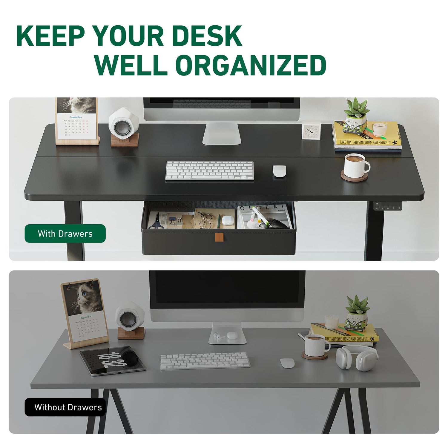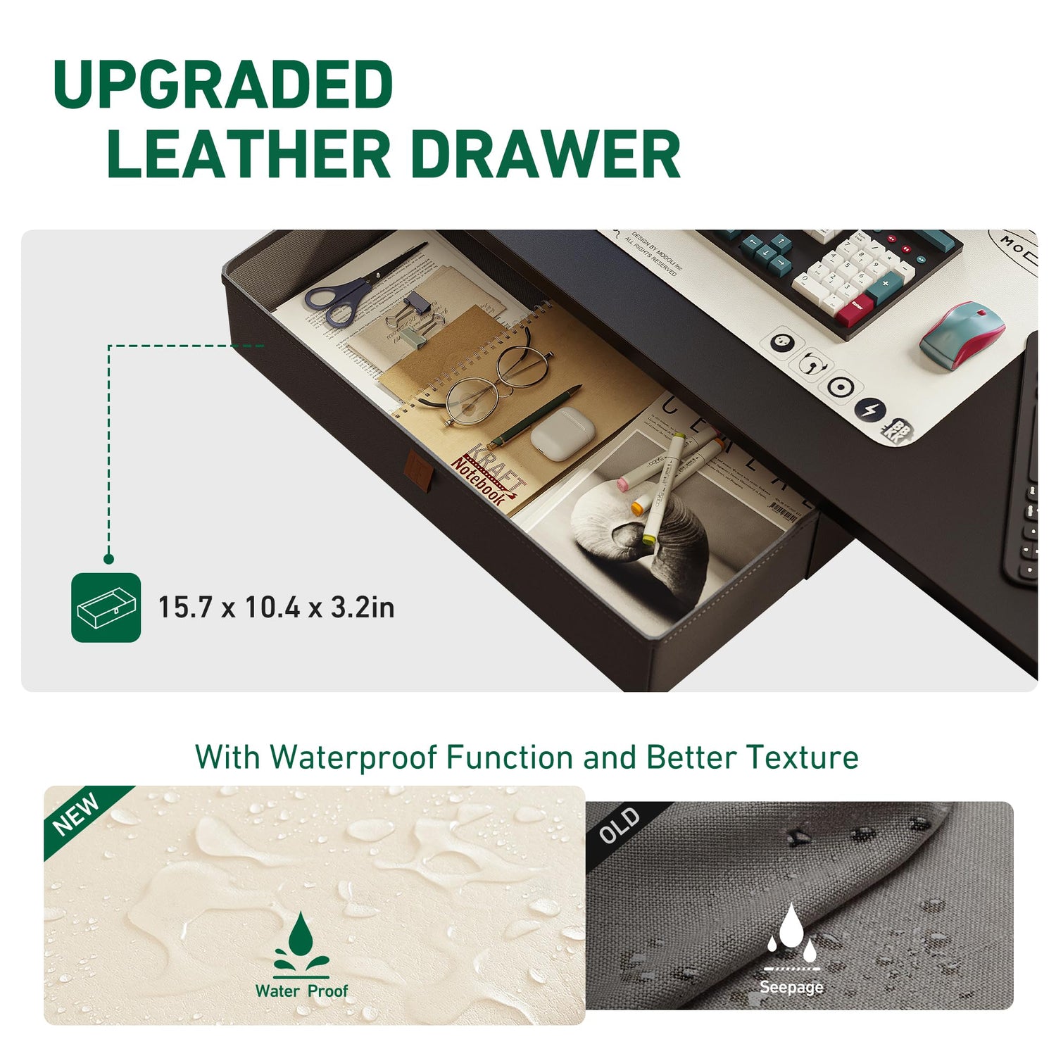 - Storage Drawer: 15.7 inches wide and 3.15 inches high storage space for daily work and life. The upgraded leather drawer with waterproof function and better texture, keep your desk clean and comfortable.