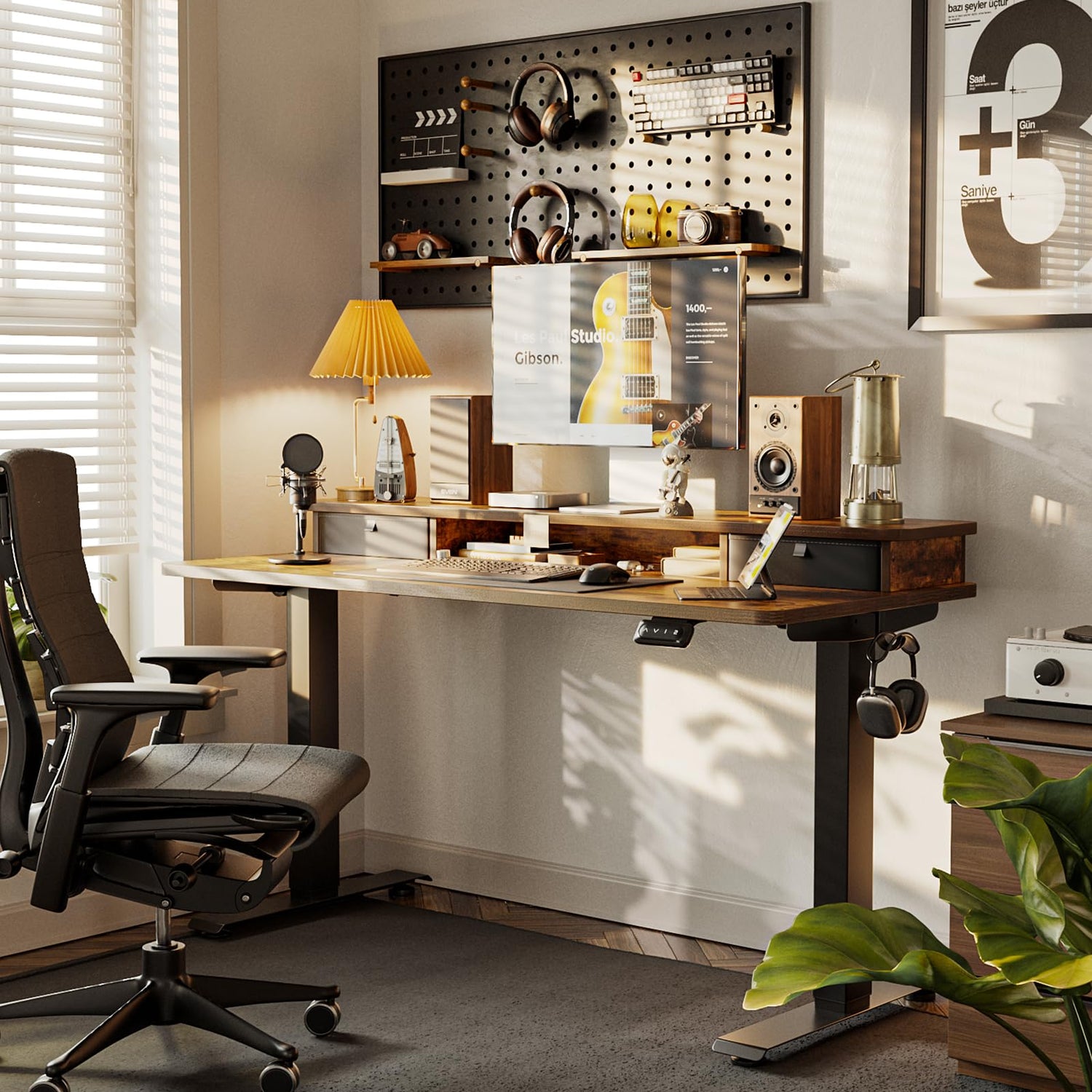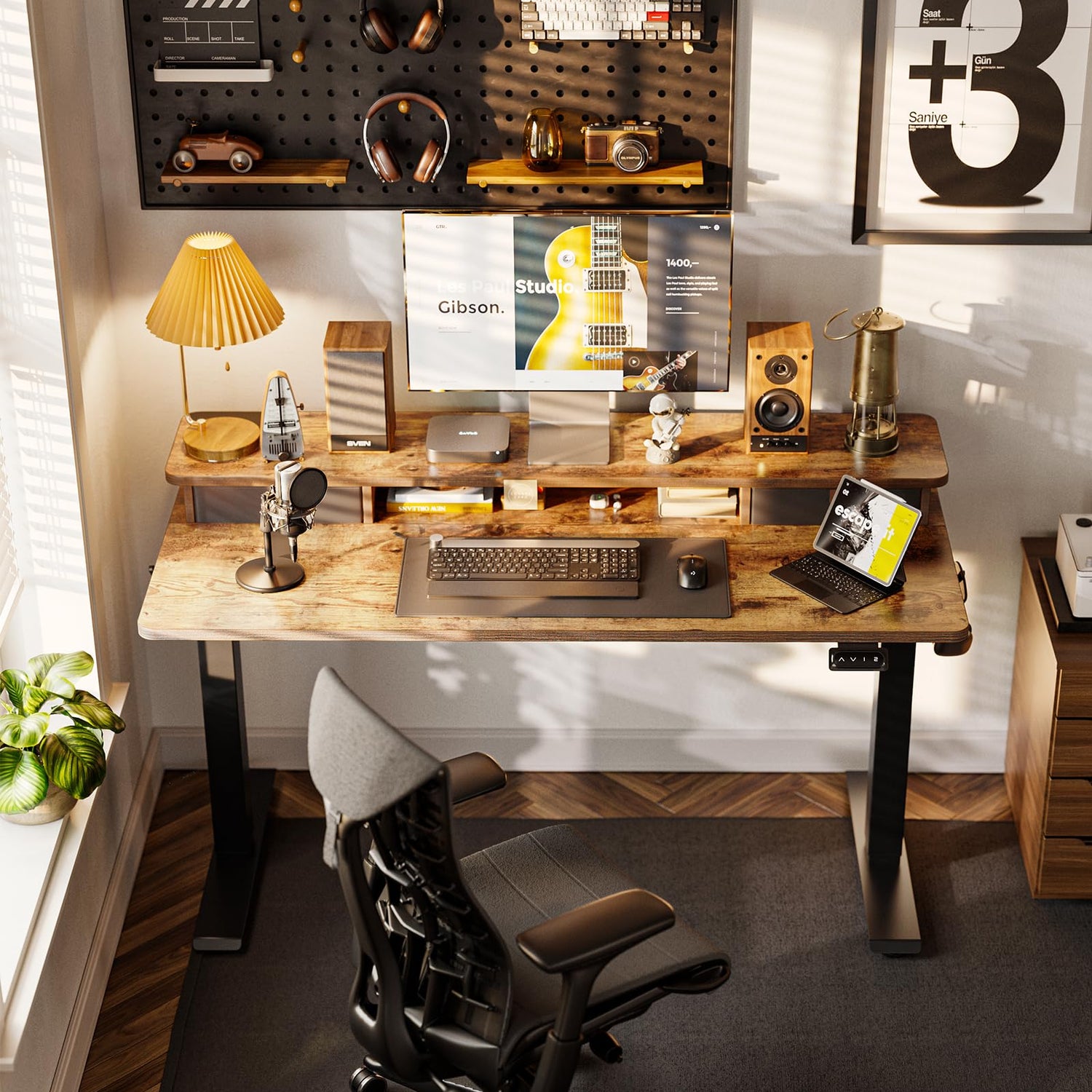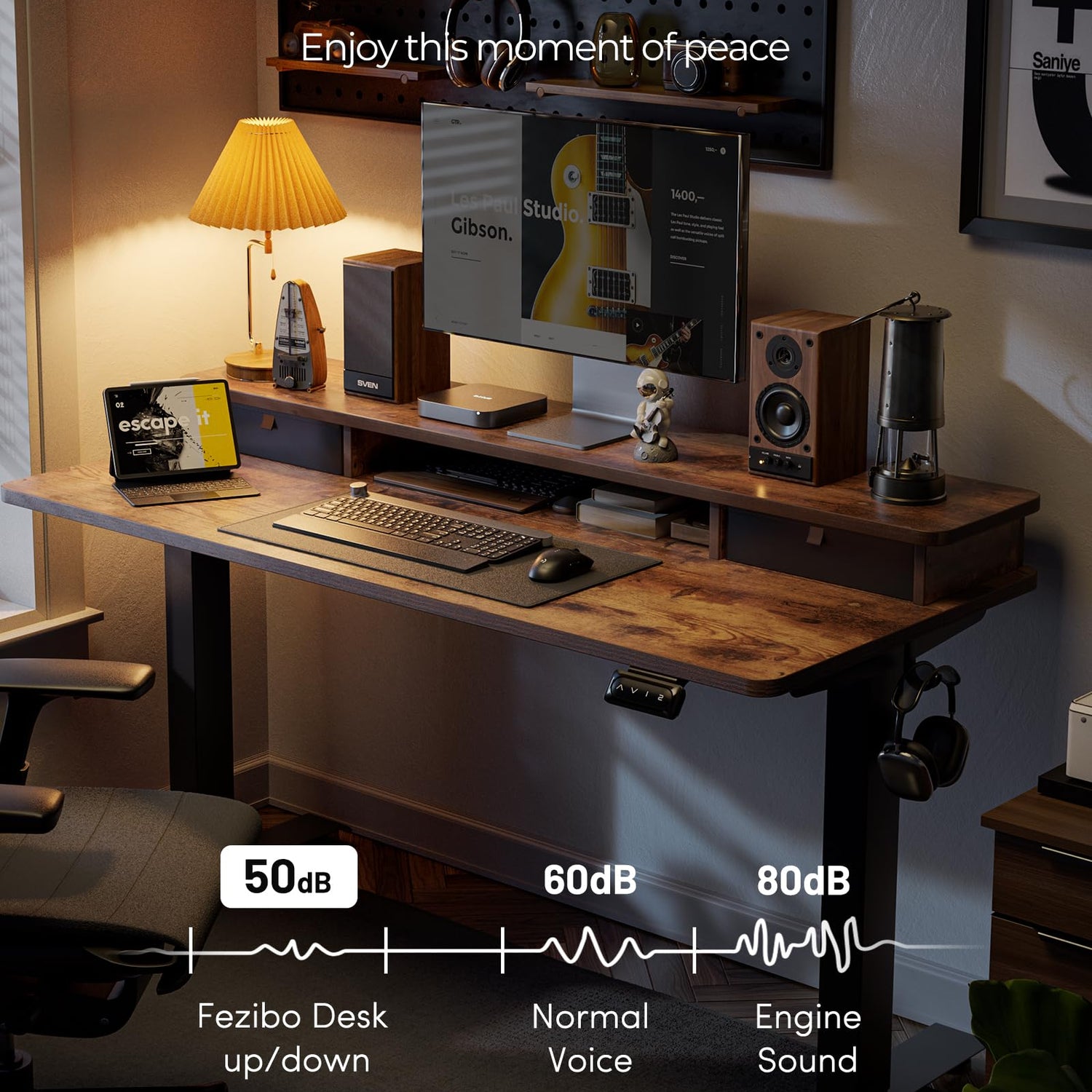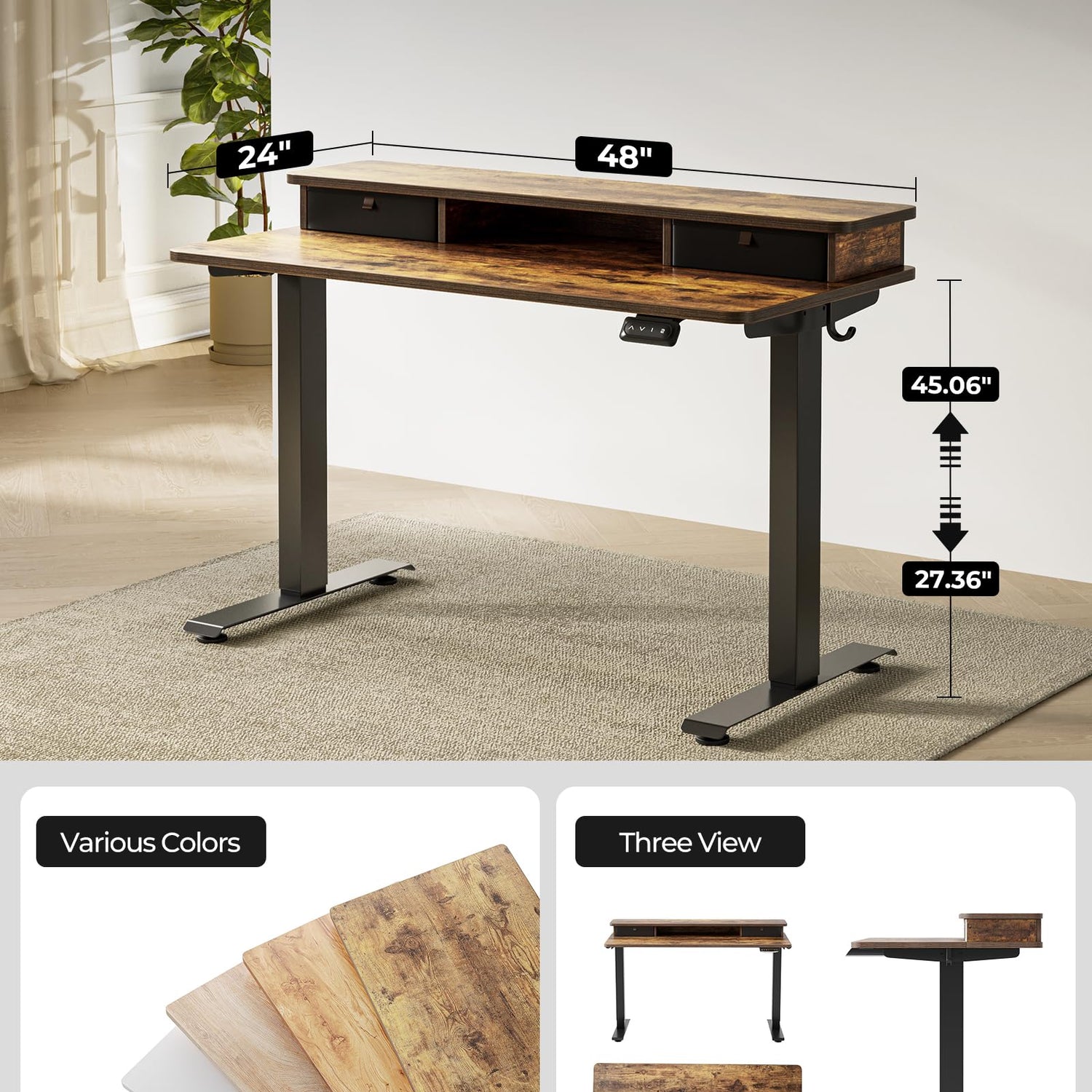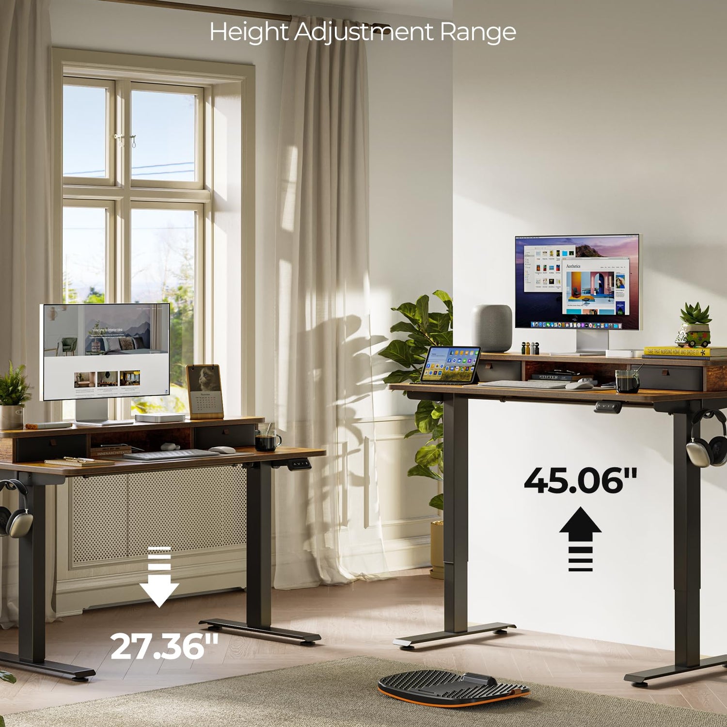 FEZIBO 48 x 24 Inch Height Adjustable Electric Standing Desk with Double Drawers, Stand up Desk, Home Office Computer Workstation with 4 Height-Adjustable Feets & 2 Hooks, Rustic Brown