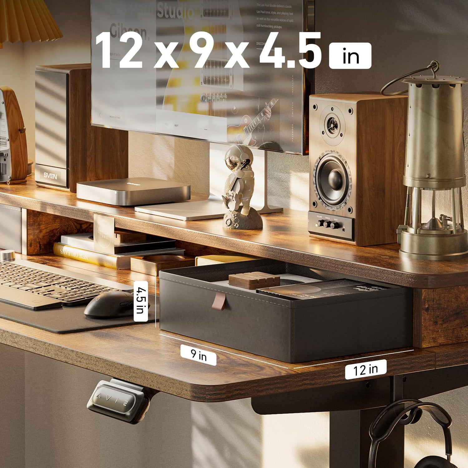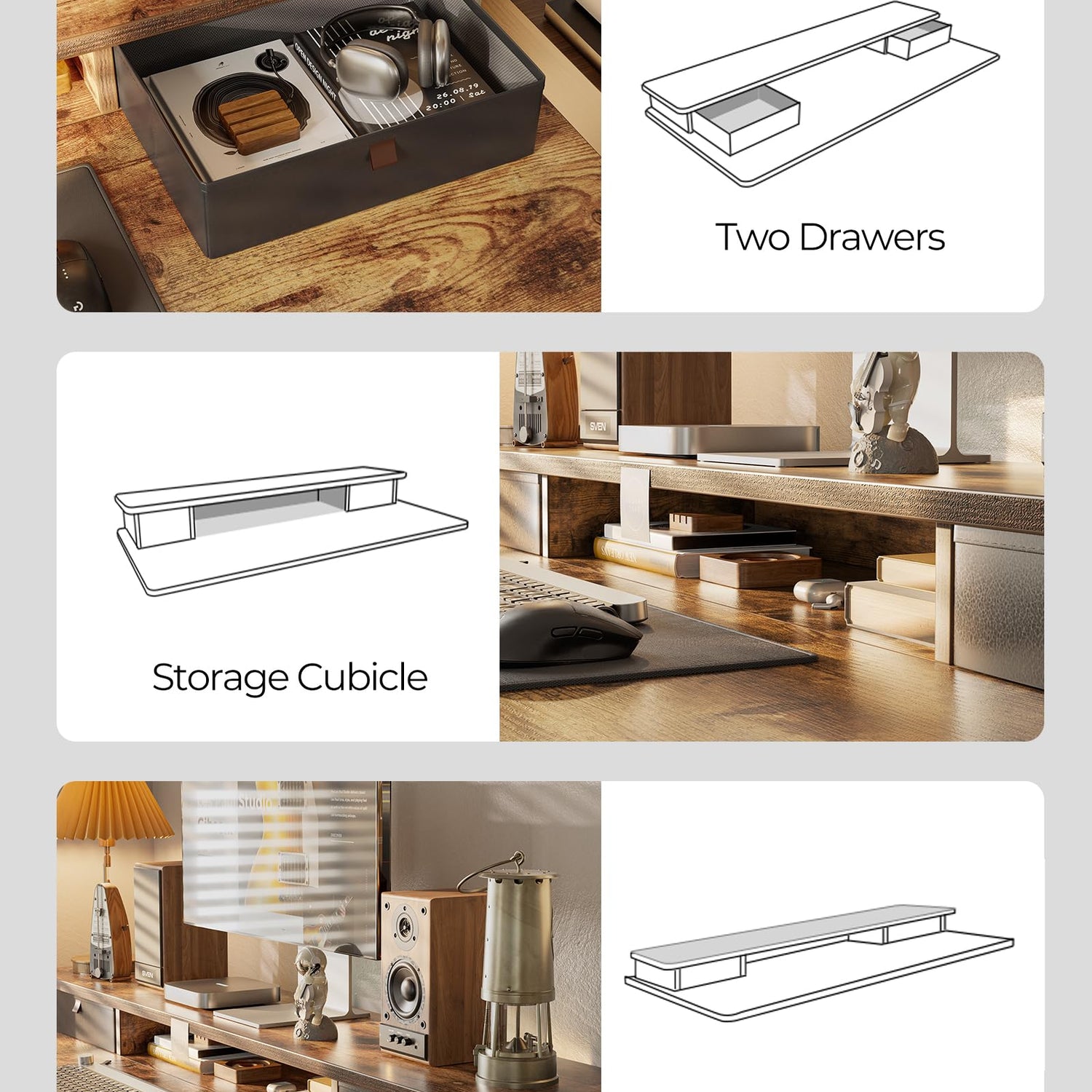 - Spacious Work Space: The top shelves with double drawer design expertly make your desktop tidier and helps you head up when you put your screen on it. The deskboard wood is FSC certified