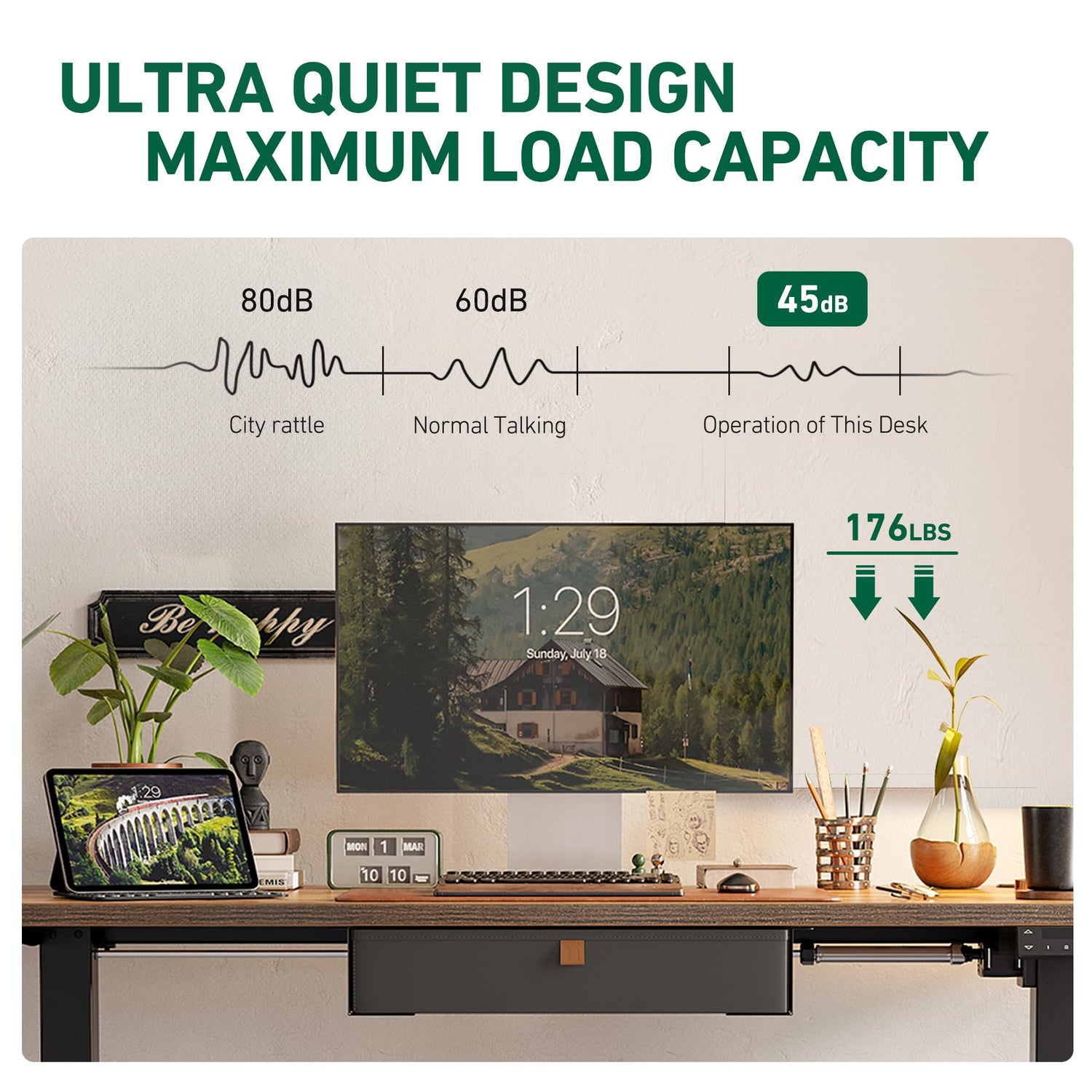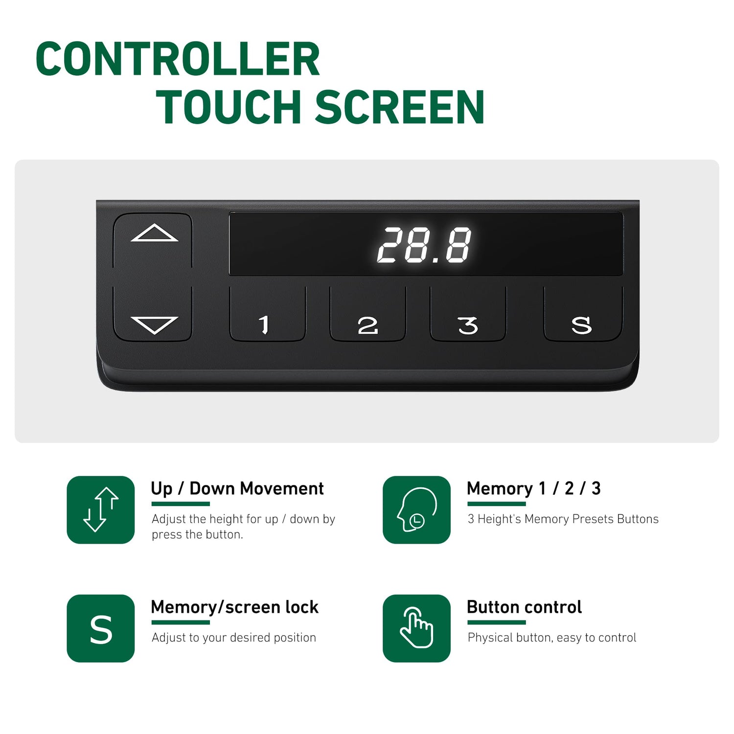 - Height Adjustable Lift: The brake system is controlled by electric motors to adjust different tabletop heights from 27.7 to 46.6 Inches. 4 Positions memory functions lift conveniently and quickly.This standing desk operates with 45 db.