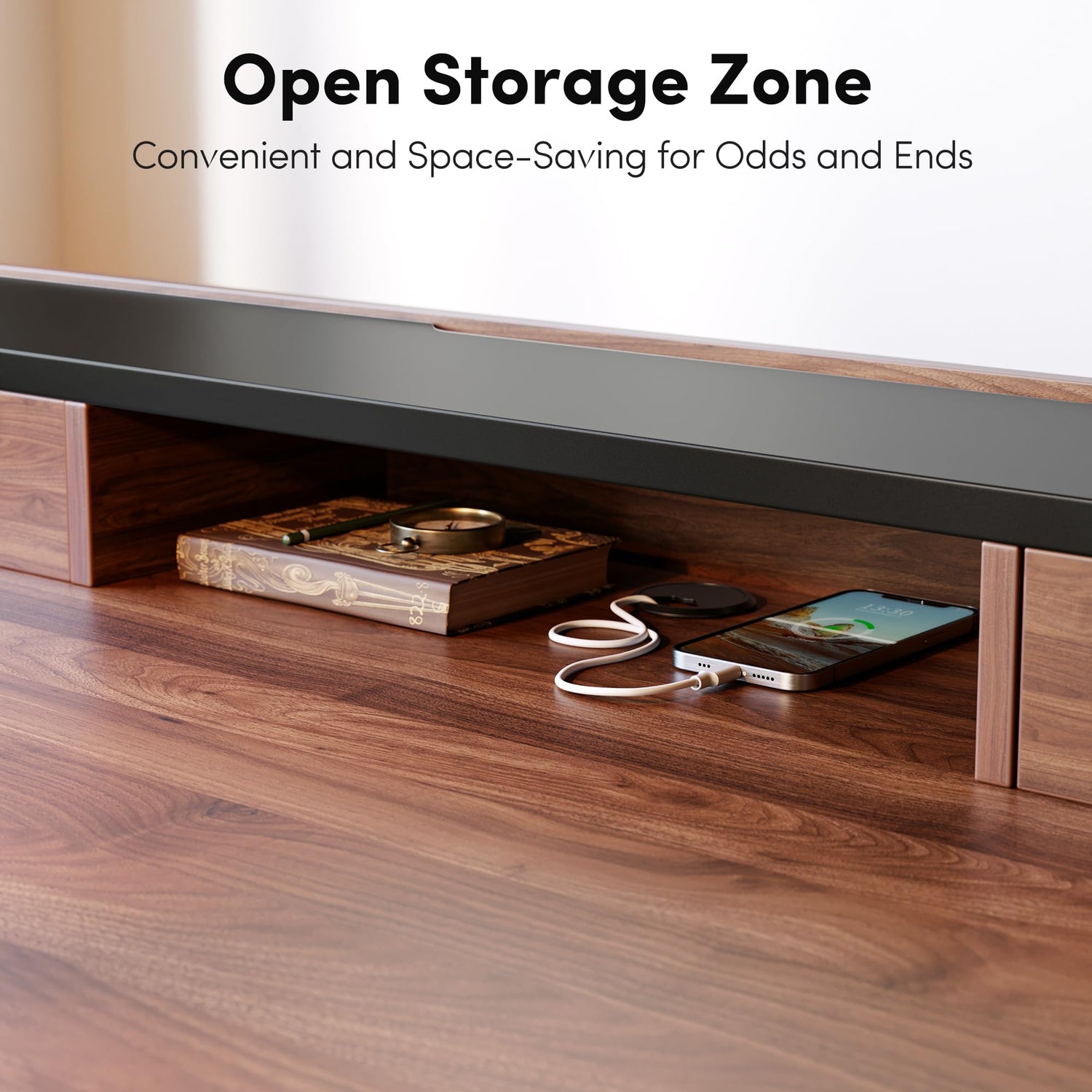 FEZIBO 55" Whole-Piece Standing Desk Adjustable Height with Drawers, 55 x 24 inches Electric Adjustable Desk with Monitor Shelf, Sit Stand Rising Desk with Baffle, Black Walnut