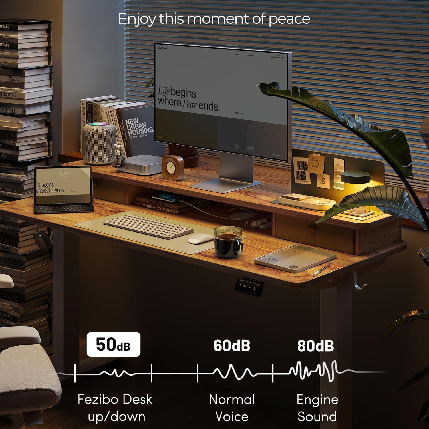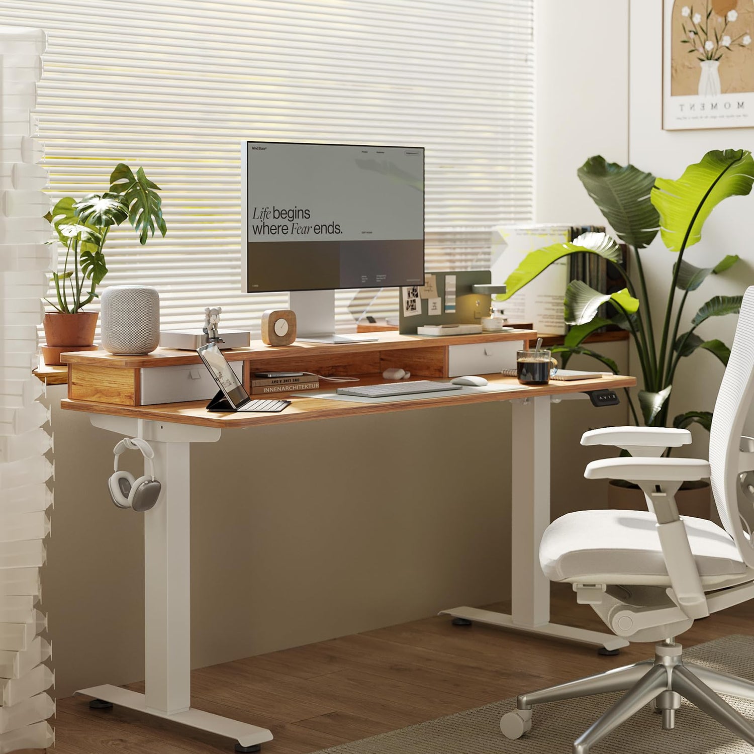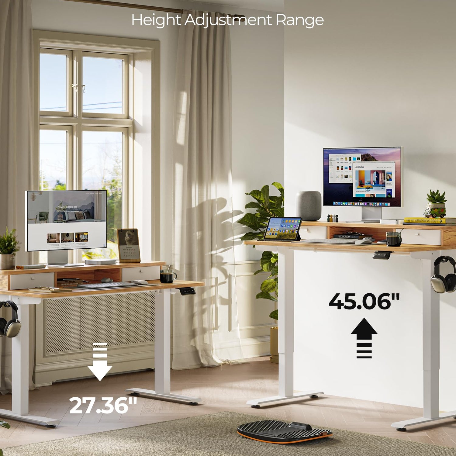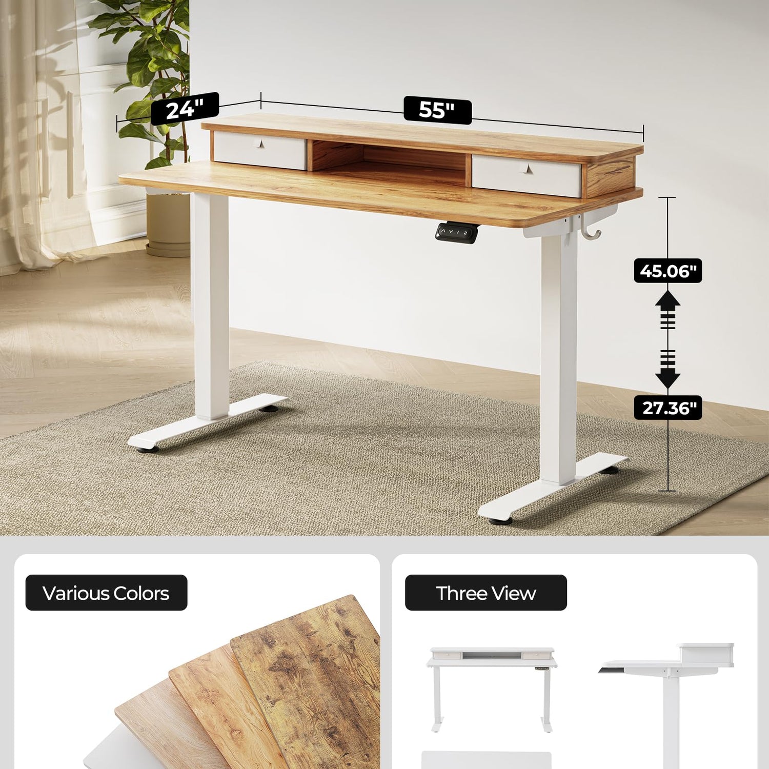 Details: FEZIBO 55 x 24 Inch Height Adjustable Electric Standing Desk with Double Drawer, Stand Up Desk with Storage Shelf, Sit Stand Desk, Light Rustic