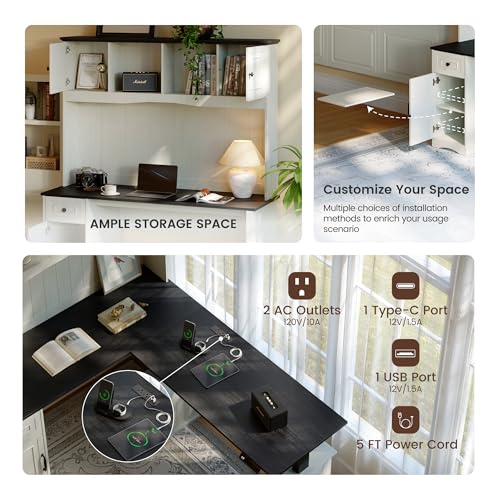 FEZIBO 60" L Shaped Executive Standing Desk with Hutch and Storage Cabinet, Farmhouse Standing Desk with Charging Station, Reversible Home Office Workstation, Antique White