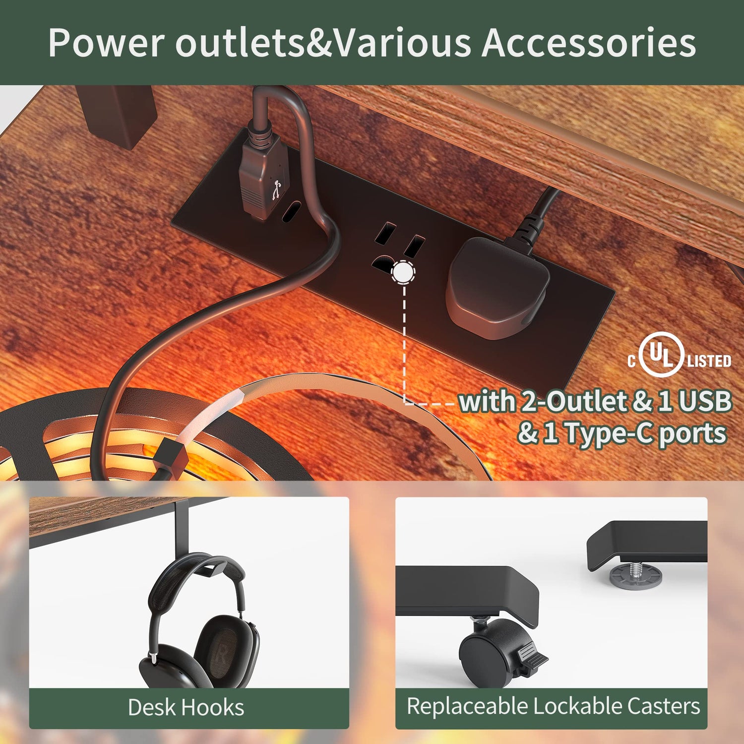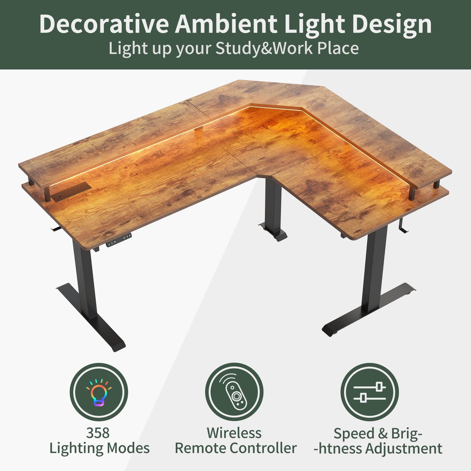 FEZIBO 63" Triple Motor L Shaped Standing Desk with LED Strip & Power Outlets, Height Adjustable Stand up Corner Gaming Desk with Ergonomic Monitor Stand, Rustic Brown Top/Black Frame