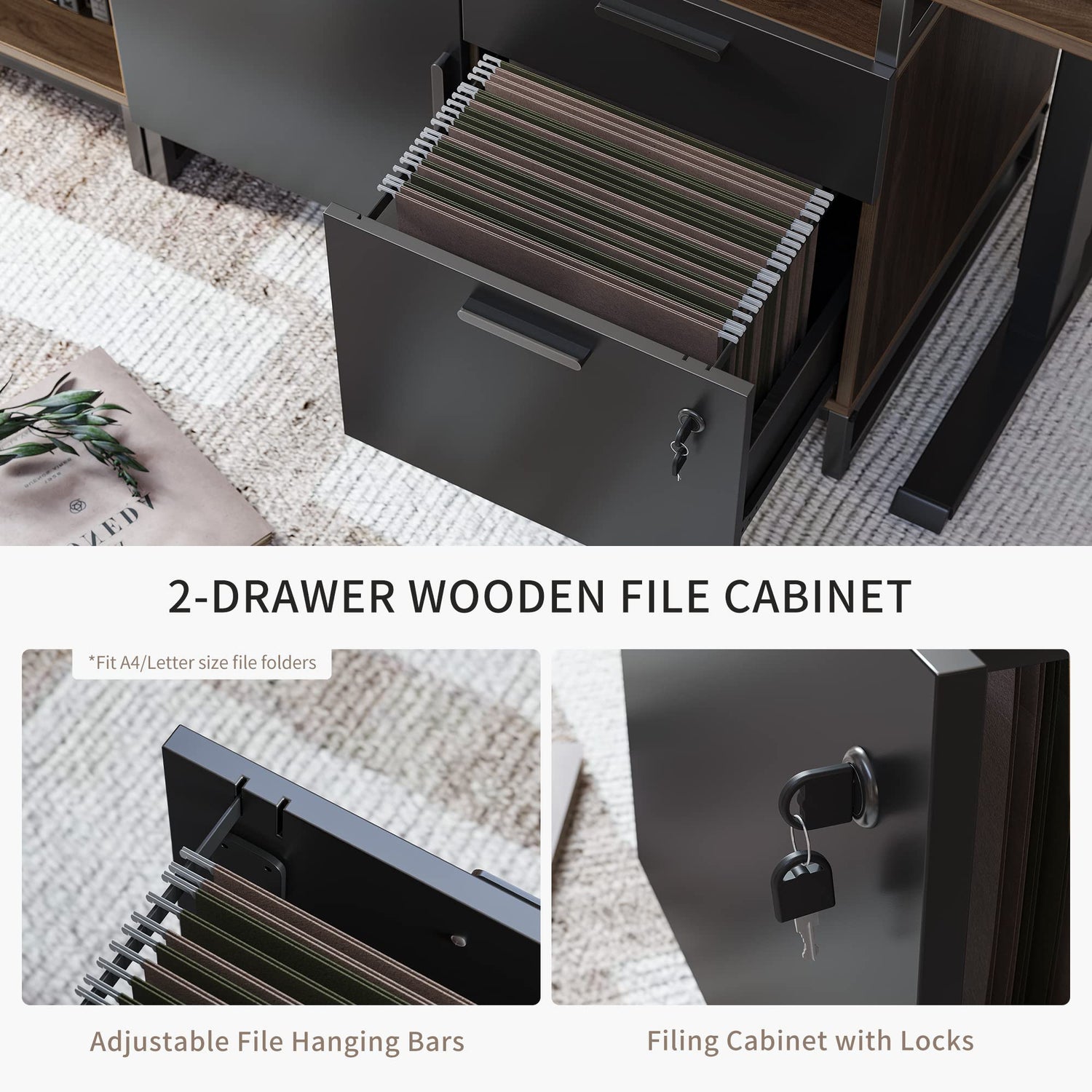 FEZIBO 66 Inch Executive L Shaped Standing Desk with 2-Drawer File Cabinet, Electric Height Adjustable Stand up Desk, Home Office Modern Wood Computer Desk with Shelves, Black Frame/Dark Walnut Top