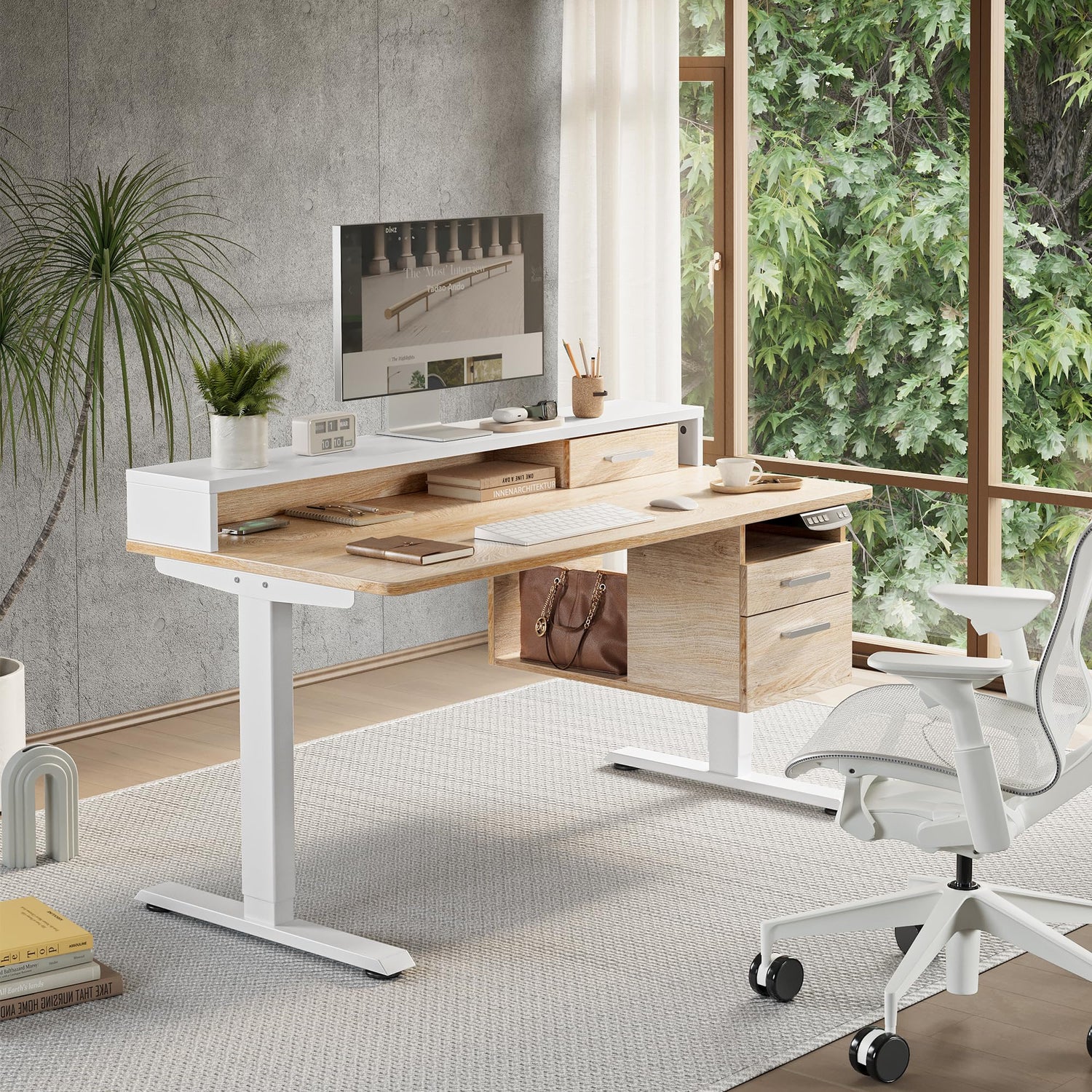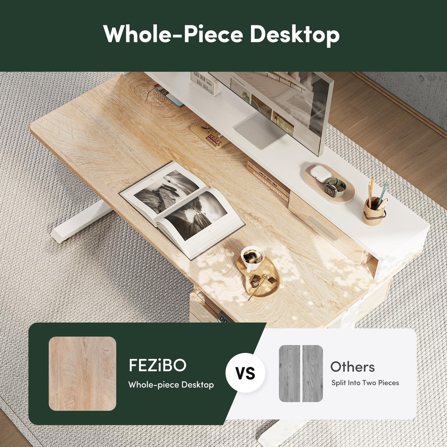 FEZIBO Electric Standing Desk 48 x 24 Inch with Monitor Shelf, 3 Drawers and Open Storage, Home Office Computer Workstation, Maple, 2 Packages