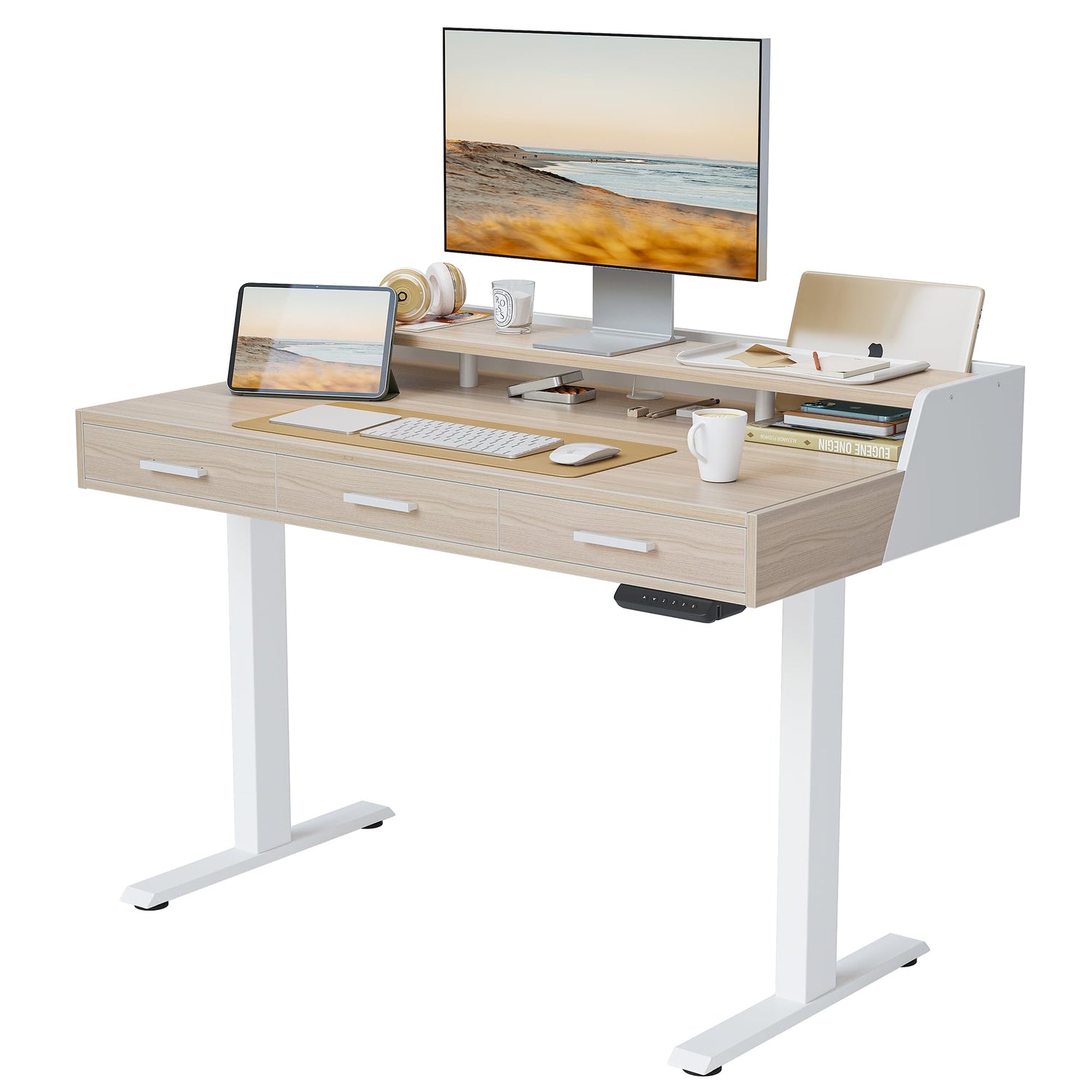 Details: FEZIBO Electric Standing Desk with Drawers, 55x26 Inch Adjustable Height, Stand Up Desk with Monitor Shelf, Sit Stand Home Office Desk, Light Walnut