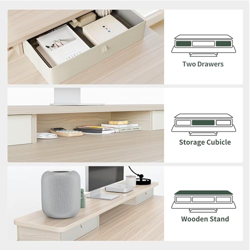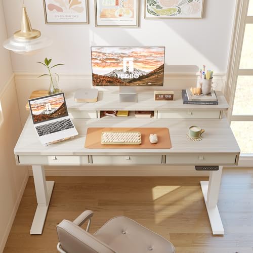 FEZIBO Height Adjustable Electric Standing Desk with 5 Drawers, 55 x 24 Inch Table with Storage Shelf, Sit Stand Desk White Frame/Light Walnut Top, 55 inch