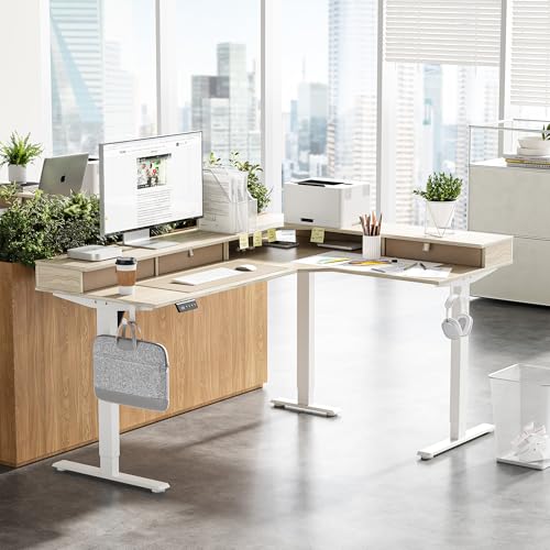 FEZIBO L Shaped Electric Standing Desk, 63 x 48inch Large with Drawers | Reversible Tabletop, 2 Memory Height Settings | Home Office & Gaming Height-Adjustable Table, Light Walnut (2 Packages)