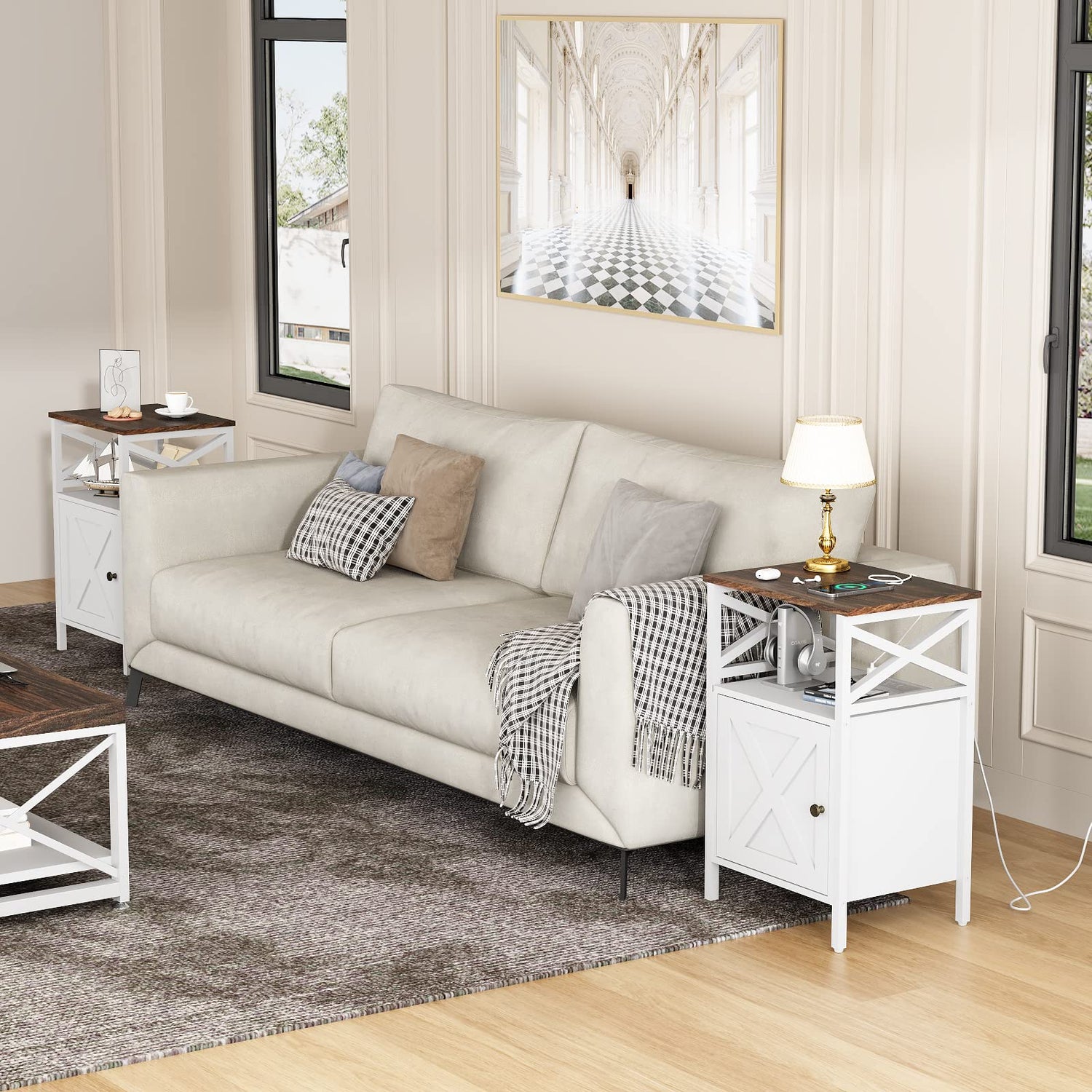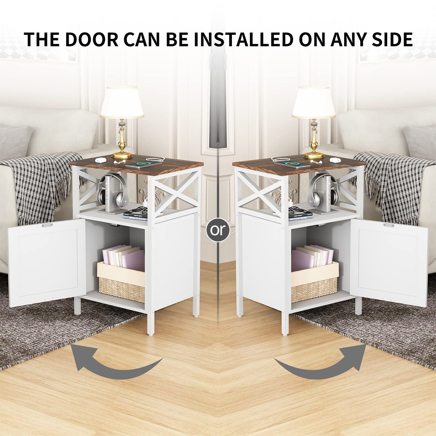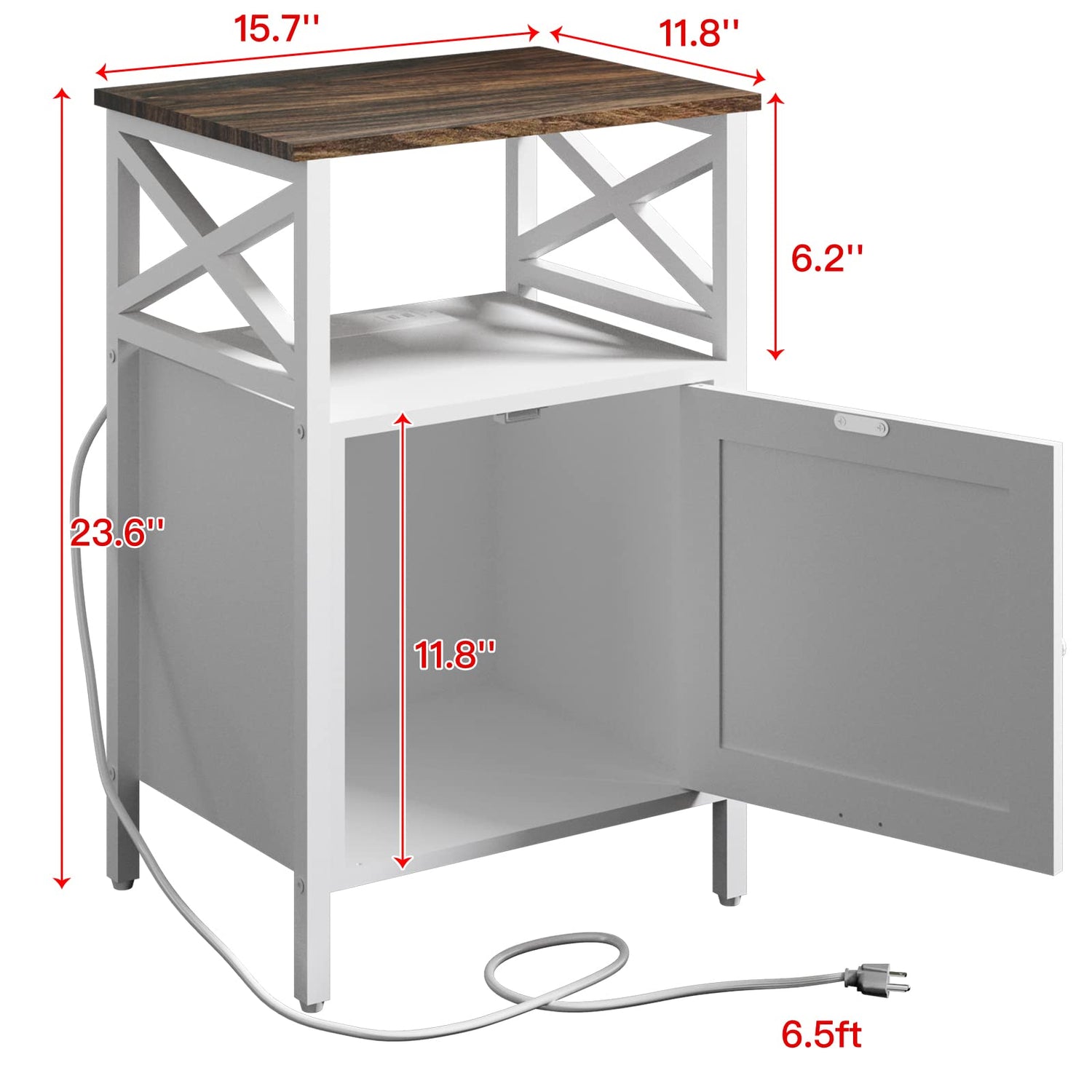FFBCFDK End Table with Charging Station, Side Table with Power Outlet & USB Ports, Nightstand with 2 Tiers Storage Space and Storage Cabinet, Sofa Side Tables for Bedroom, Living Room,Office, White