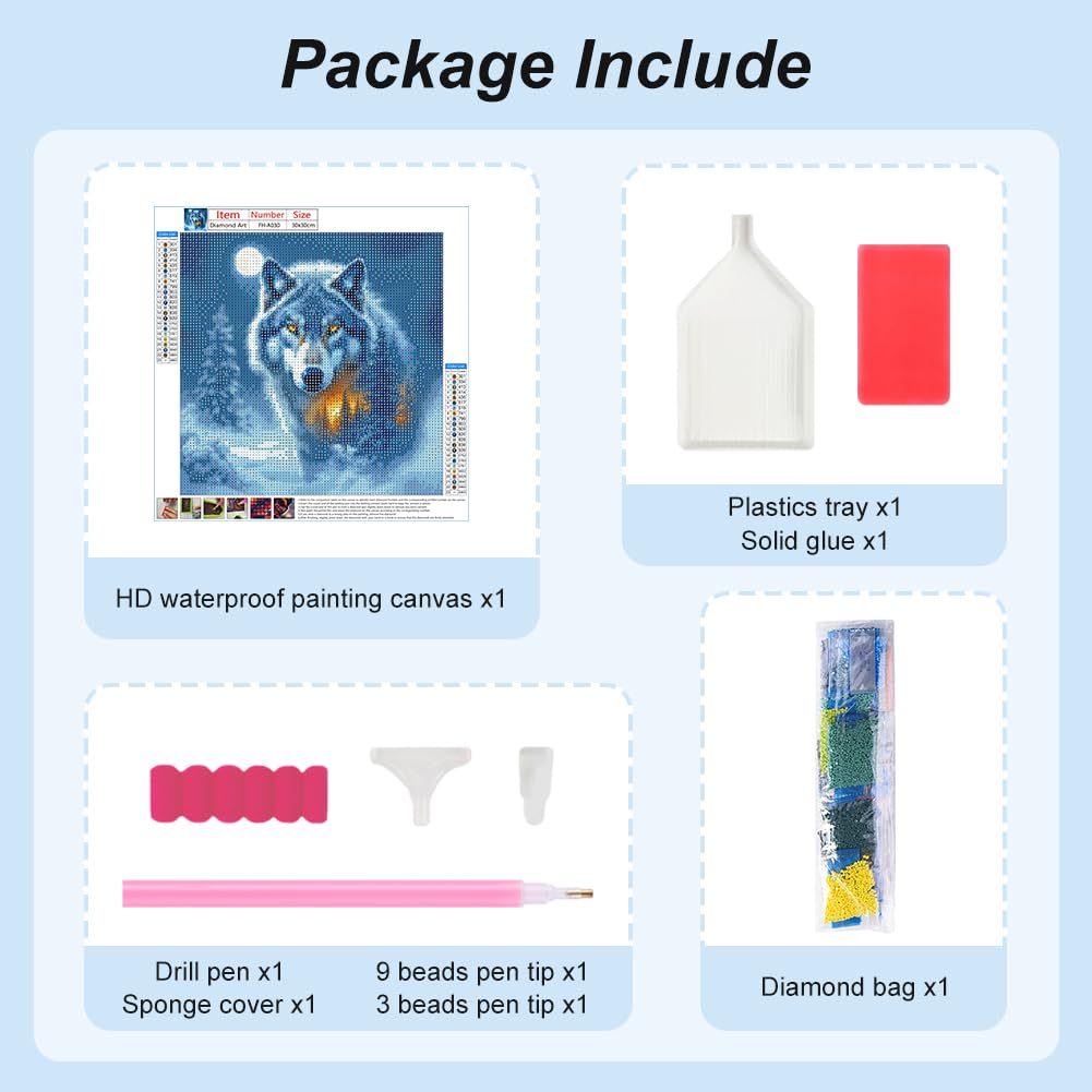 - 【CONTAIN ALL TOOIS】: Wolf Diamond painting kits contain all tools:1*HD canvas, 1*set drill bags, 1*drill pen, 1*jelly glue, 1*tray, 1*9 beads pen tips, 1*3 beads pen tips, so you don’t need to purchase any additional tools. And all diamonds are provided 30% more than needed