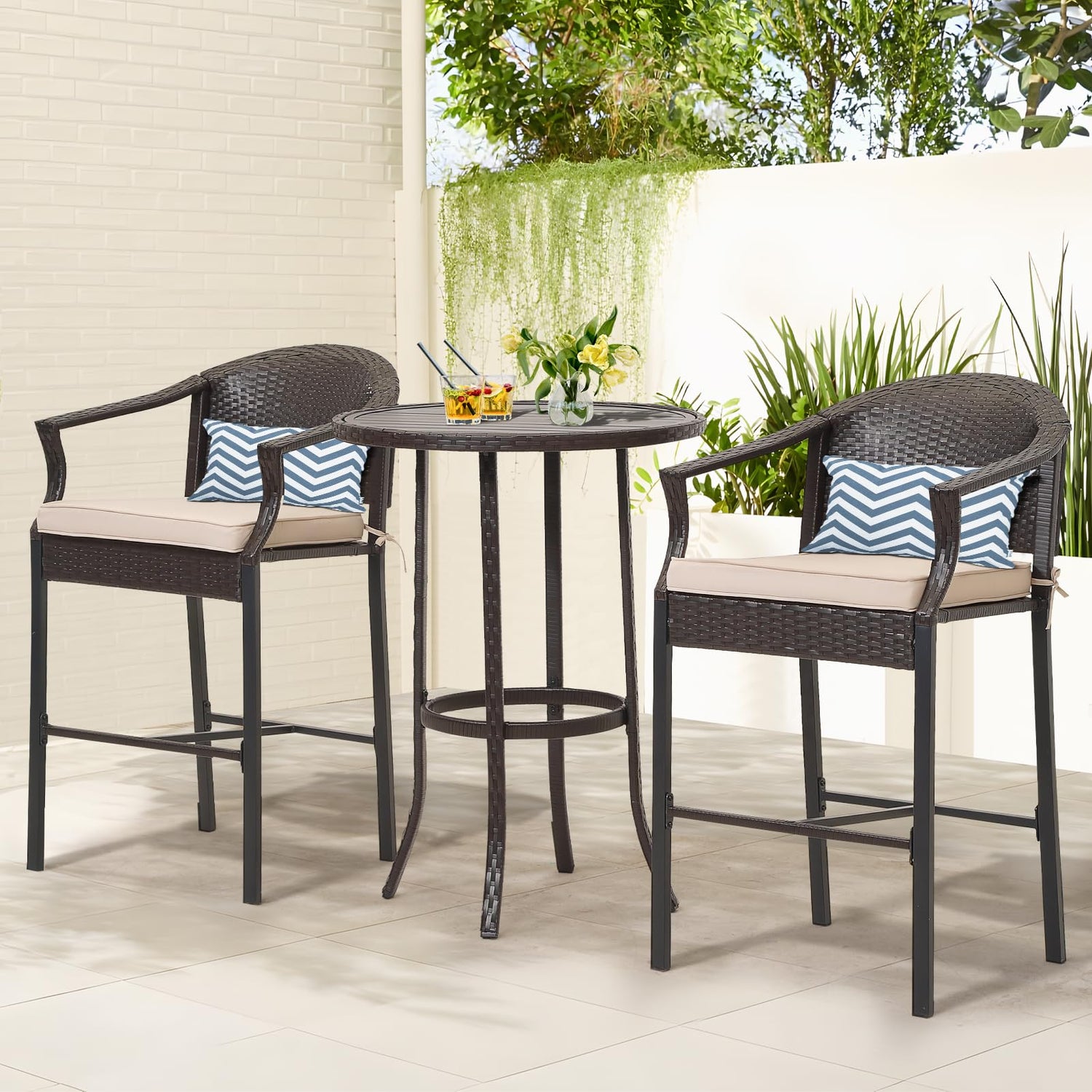 - 3 Piece Bar Height Patio Sets: Includes: 2x high wicker barstool with cushions,1x high top patio table. Cushion with lace-up design prevents the seat cushion from sliding around. Bar table with metal top, easy to clean, simply wipe clean with a damp cloth