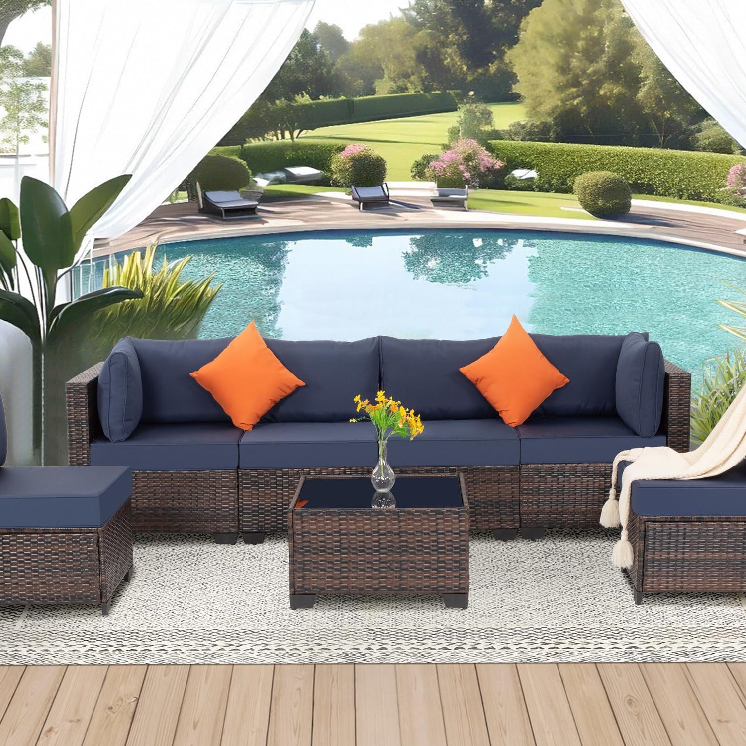 FHFO 7 Piece Outdoor Wicker Patio Furniture Set, Rattan Sectional Sofa Couch, Patio Conversation Set with Cushion & Coffee Table, for Backyard Poolside Porch Garden, Brown-Blue