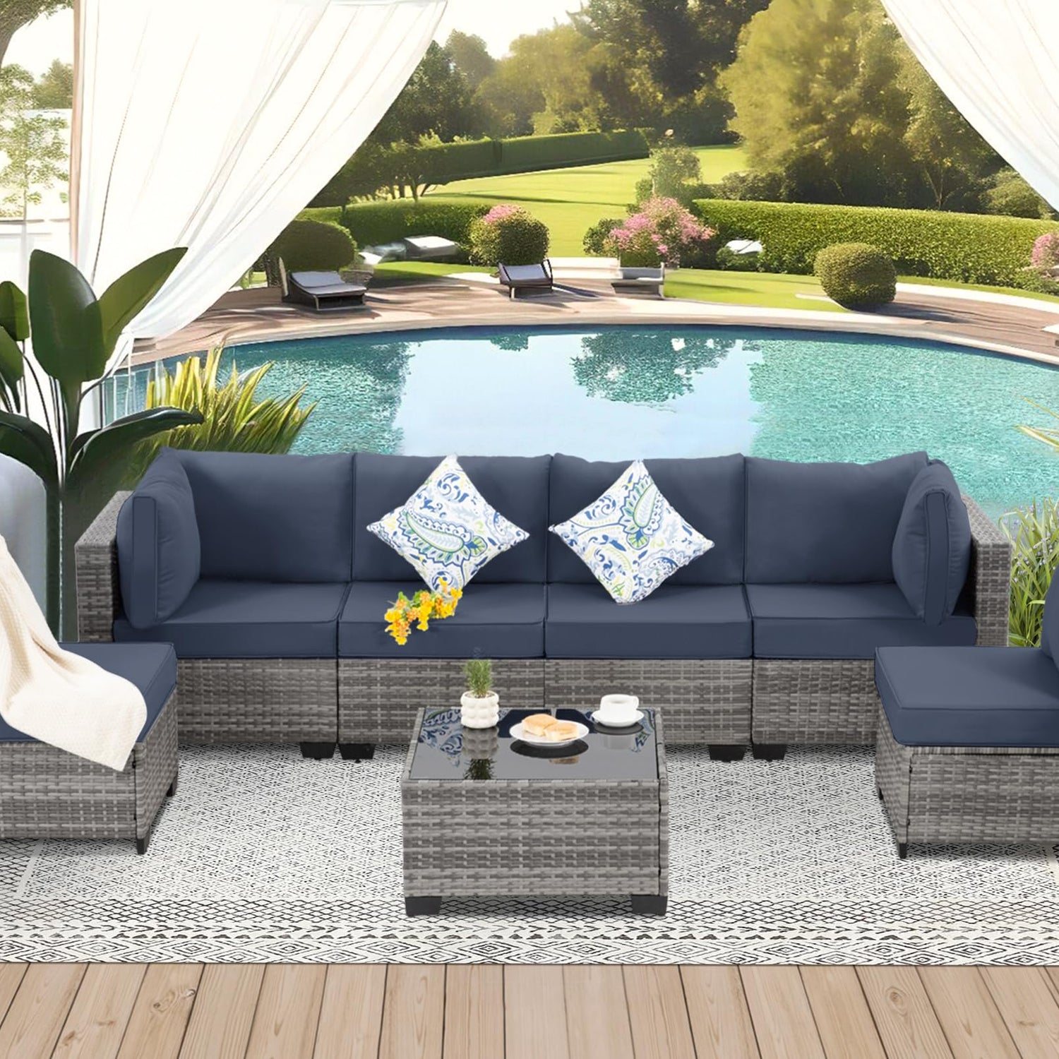 FHFO 7 Piece Outdoor Wicker Patio Furniture Set, Rattan Sectional Sofa Couch, Patio Conversation Set with Cushion & Coffee Table, for Backyard Poolside Porch Garden, Grey-Navy Blue