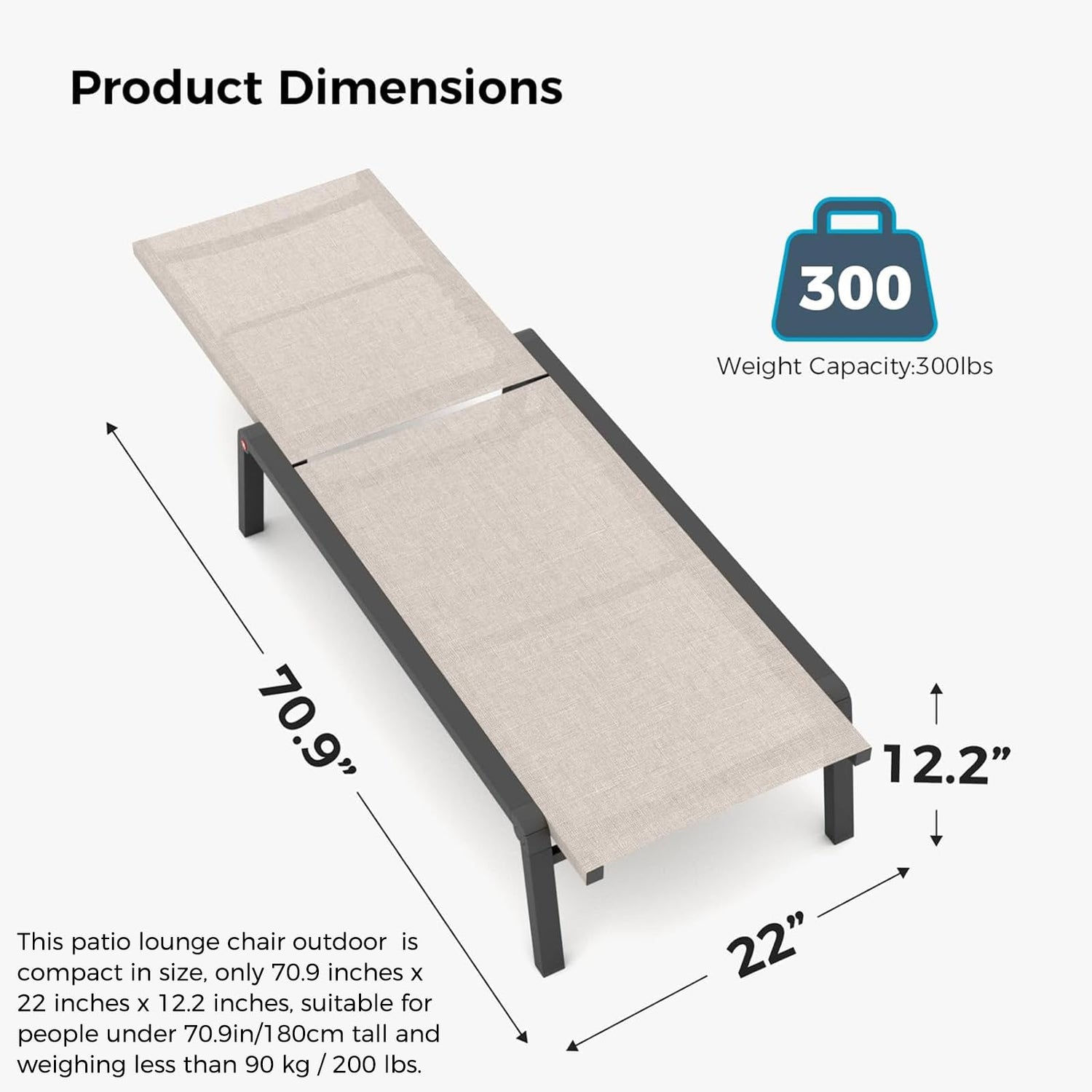 - 【BREATHABLE FABRIC & ALUMINUM FRAME】: The lounge chairs for outside are made of Textilene Fabric and aluminum frame, which is comfortable, durable, UV resistant, non-aging, waterproof, and rust-proof for lasting use.