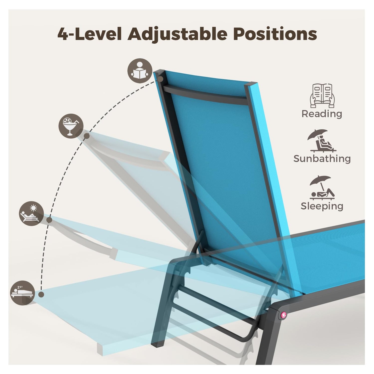 - 【BREATHABLE FABRIC & ALUMINUM FRAME】: The lounge chairs for outside are made of Textilene Fabric and aluminum frame, which is comfortable, durable, UV resistant, non-aging, waterproof, and rust-proof for lasting use.