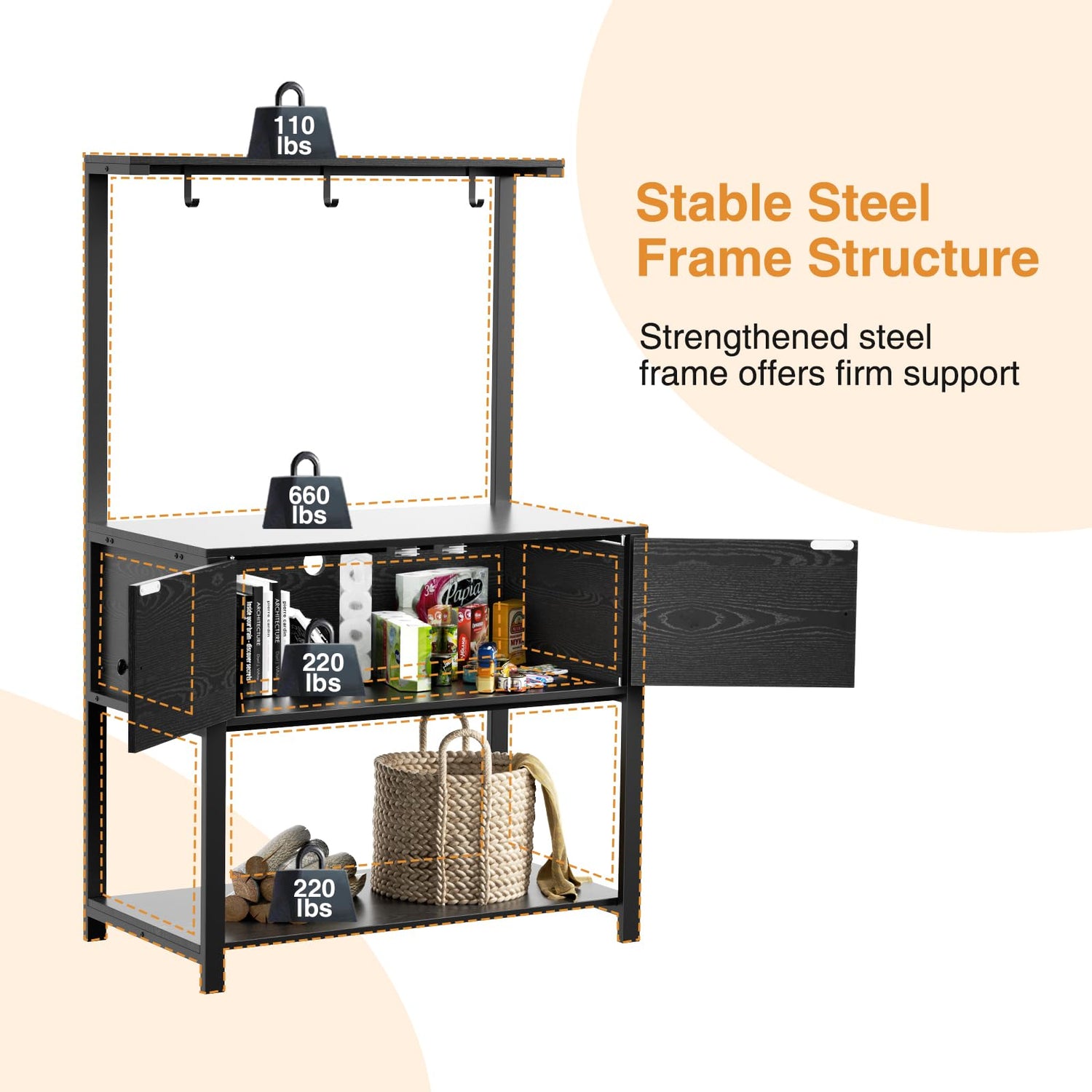 -Weight capacity:660lbs(Tabletop)/110(Shelves & Cabinet).