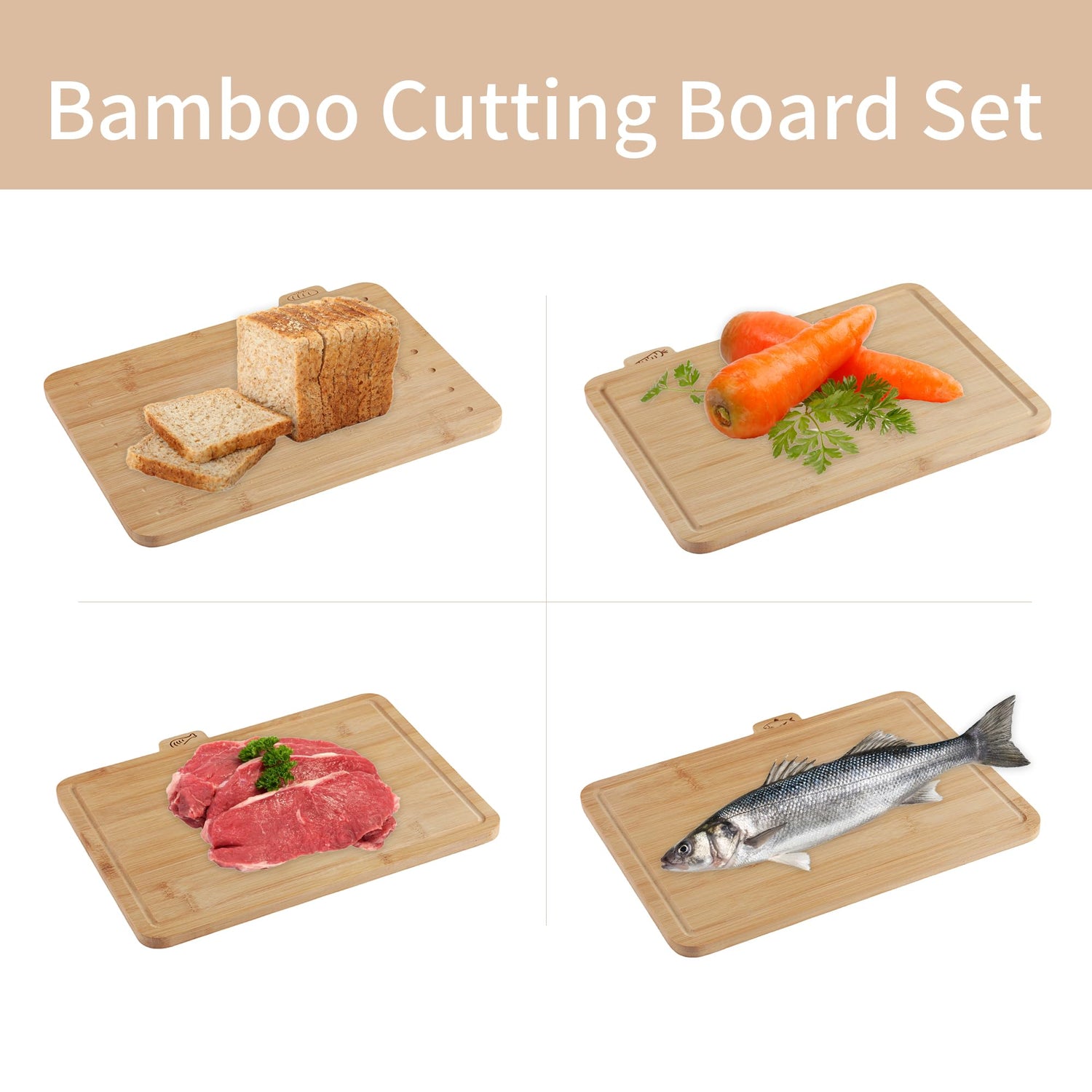 - ORGANIZED COOKING WITH FOOD ICONS: Our Bamboo Wood Chopping board Set includes four boards labeled with food icons - no more mixing up your veggies and meat. Enjoy a well-organized, efficient kitchen!