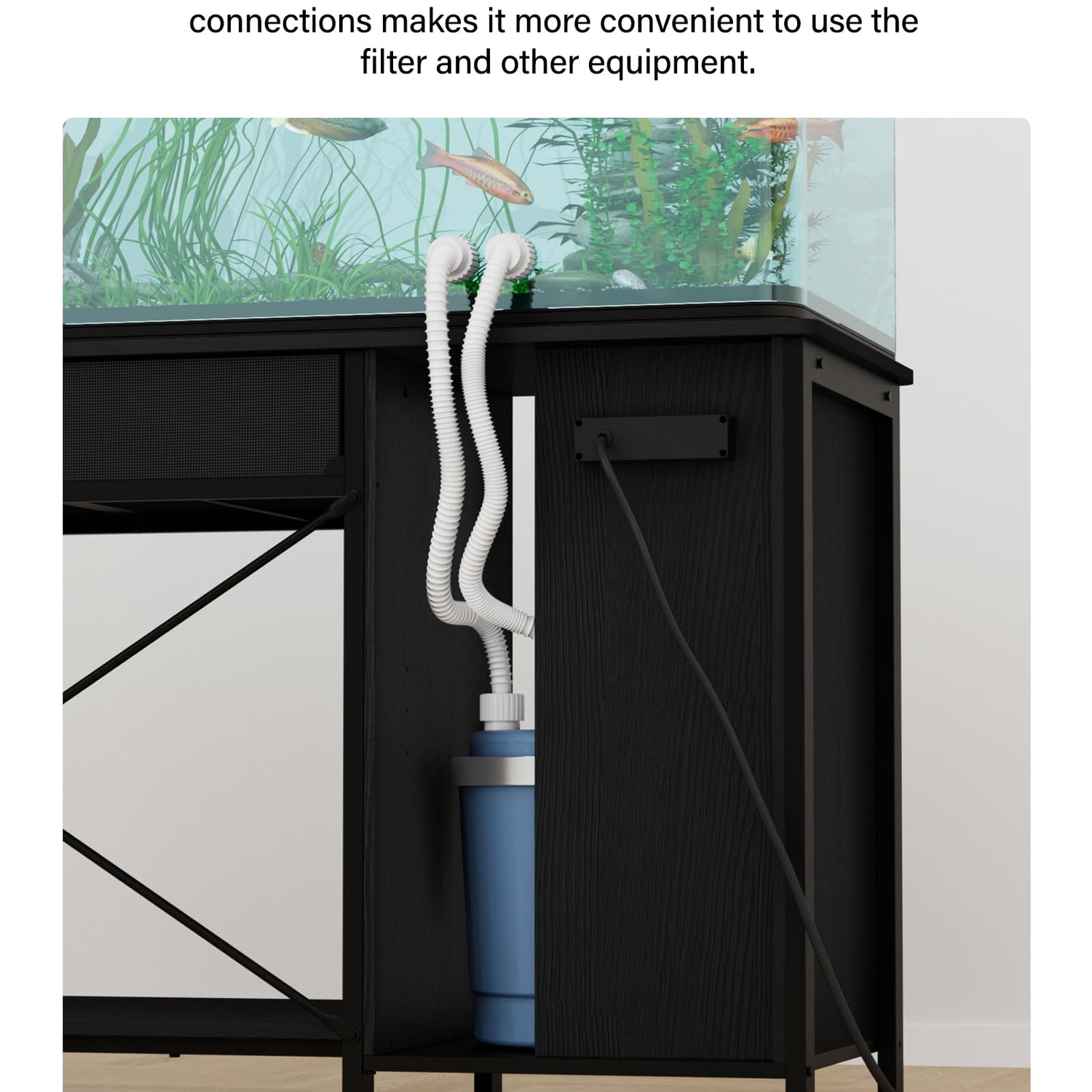 - Tank Stand with Storage Cabinet: 2-tier fish tank cabinet for 40 gallon fish tank smaller than 40"x17" on the tabletop (41"x18") and 5-10 gallon aquarium on the bottom. Additionally,The left cabinet of tank stand includes a removable shelf that can be adjusted to store fish food, cleanning tool, supplies, and equipment conveniently. The back of the tank stand has a 6" slot, which not only facilitates pipe connections but also improves airflow within the cabinet, preventing moisture buildup.