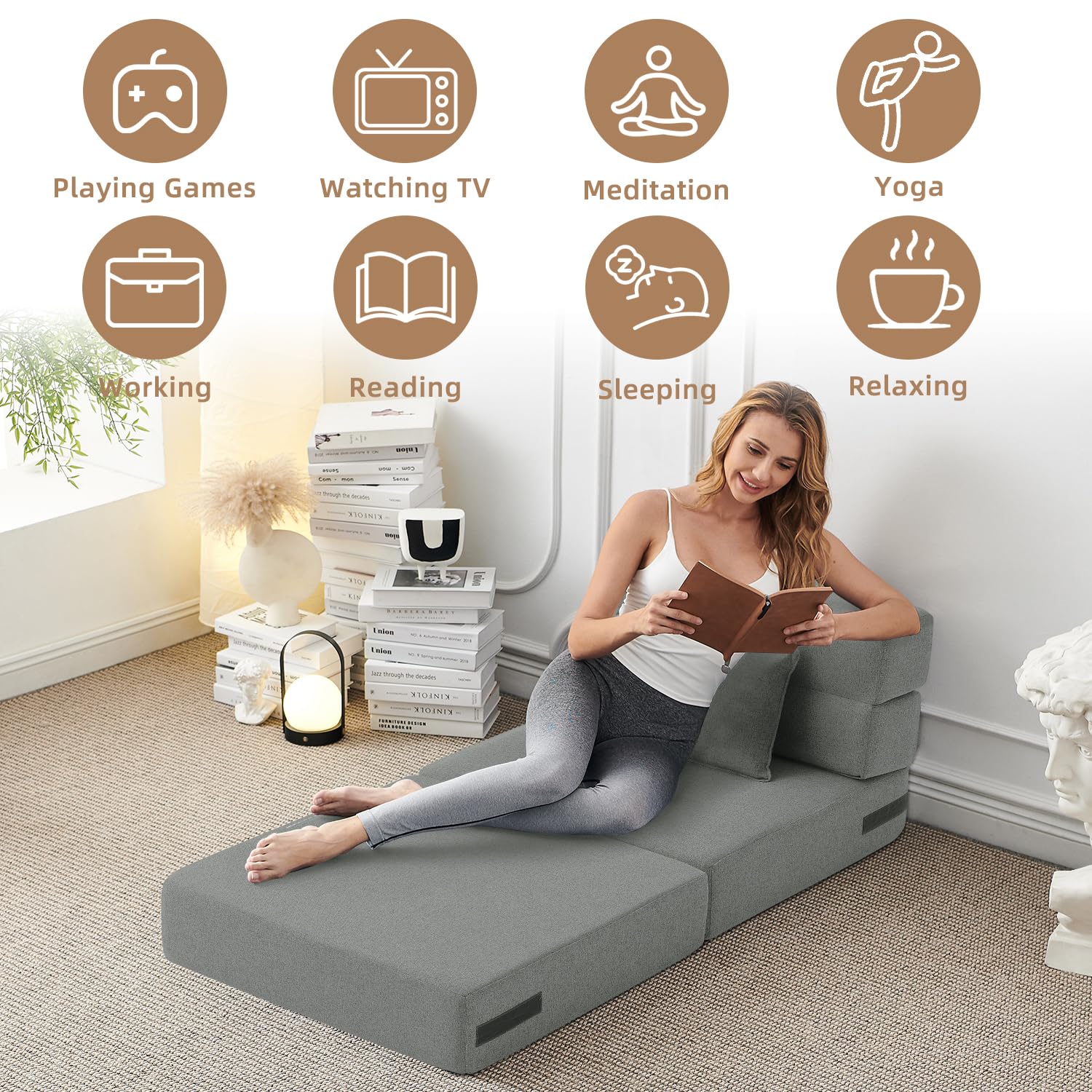 FILUXE Convertible Folding Sofa Bed - Sleeper Chair with Pillow, Modern Linen Fabric Floor & Futon Couch, Foldable Mattress for Living Room/Dorm/Guest Use/Home Office/Apartment, Single Size Light Gray