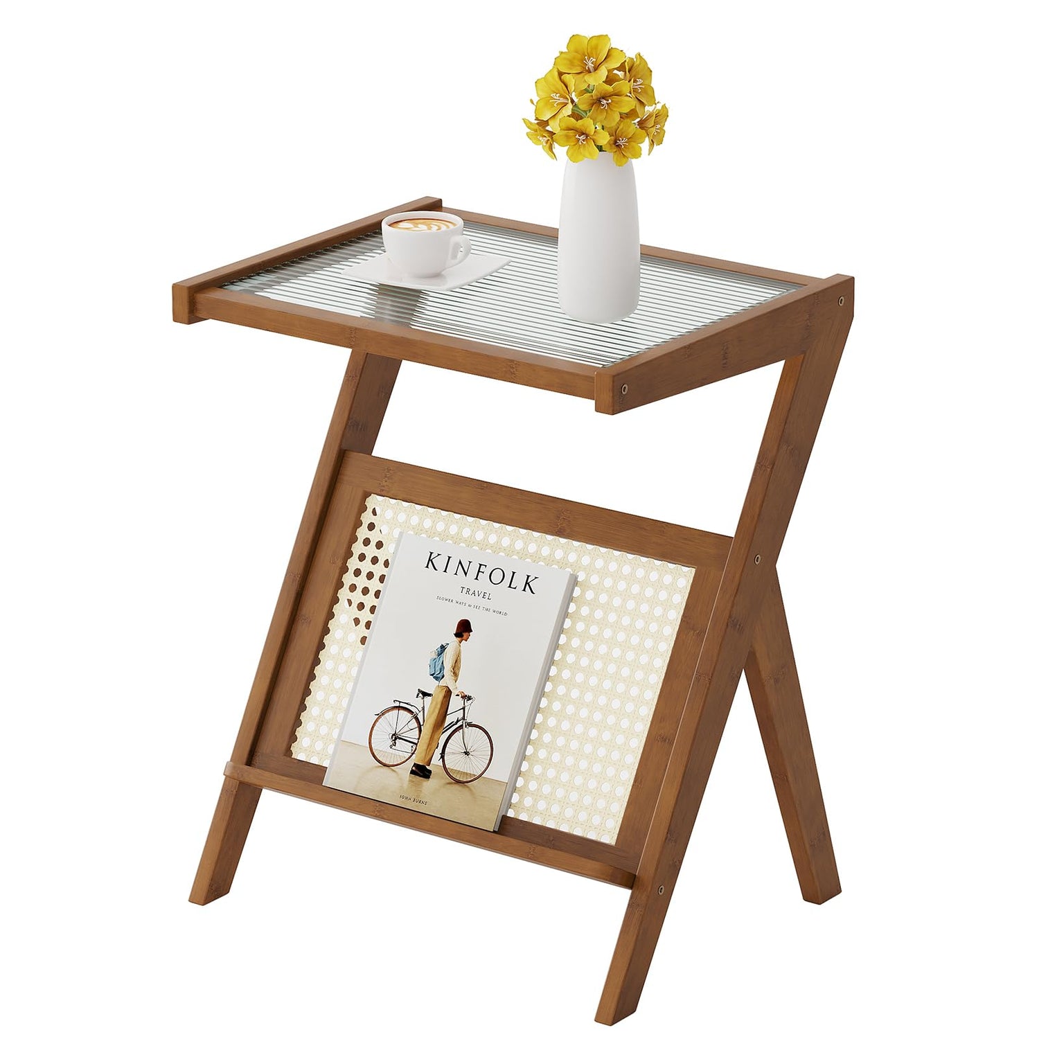 - 【Sturdy and Stable】This end table is made of bamboo, the material is thicker and thickened to be sturdy and stable, the Z-shaped triangle structure is stable, the rattan structure of the mesh and corrugated glass is very artistic, simple and fashionable. The tabletop is round and smooth, easy to clean.