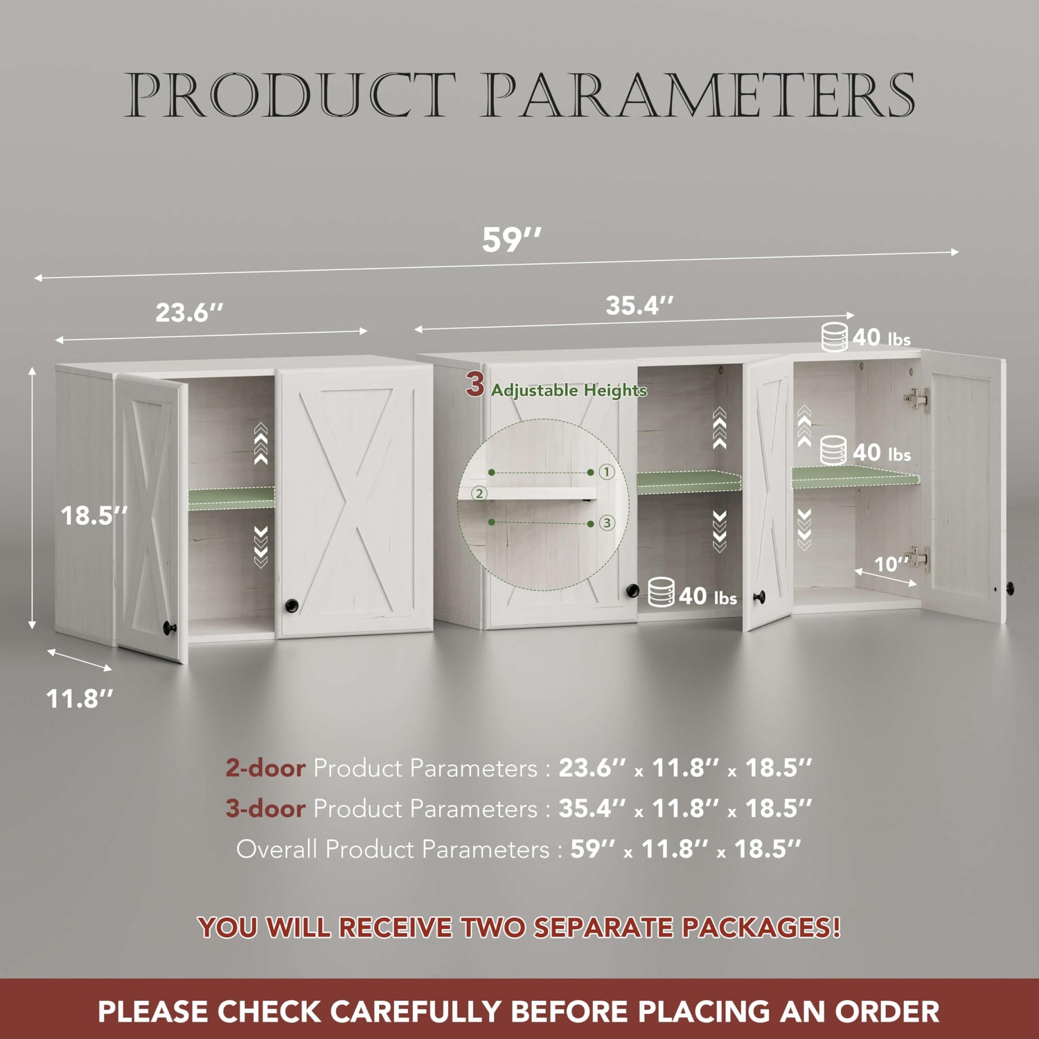 Details: The FIMELLO 59’’ Wall Cabinets offer stylish, space-saving storage. The set includes a 23.6" (Wx11.8"Dx18.5"H) and a 36" (Wx11.5"Dx18.5"H) cabinet, totaling 59" in width. These wall-mounted cabinets maximize space with adjustable shelves and a 10-inch depth, perfect for storing taller items like detergent or kitchen jars. The farmhouse-inspired barn door design with a white wood grain finish suits kitchens, bathrooms, or laundry rooms. Made from durable engineered wood, they're moisture- and scratch-resistant. Easy assembly with labeled parts, a step-by-step guide, and 24/7 support.