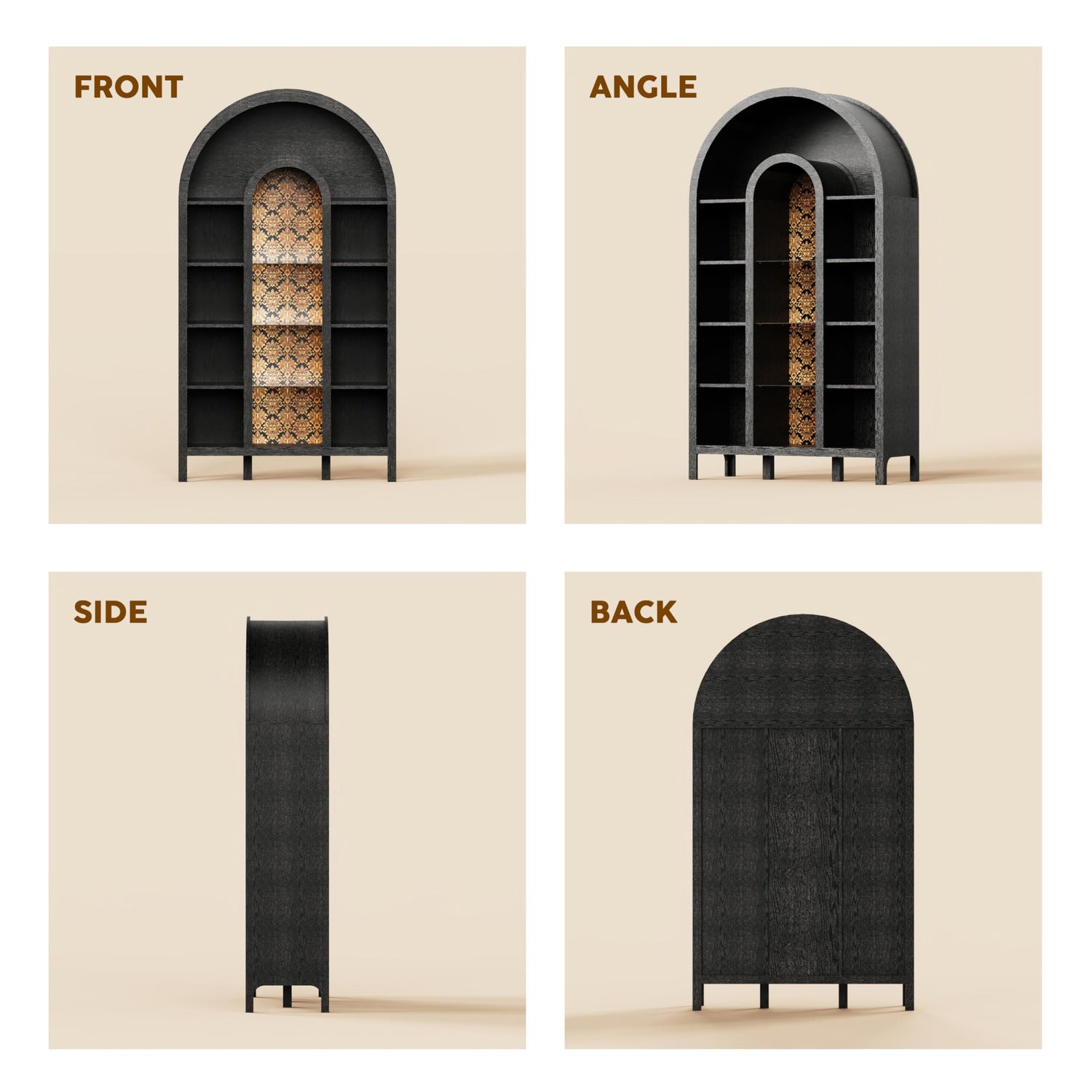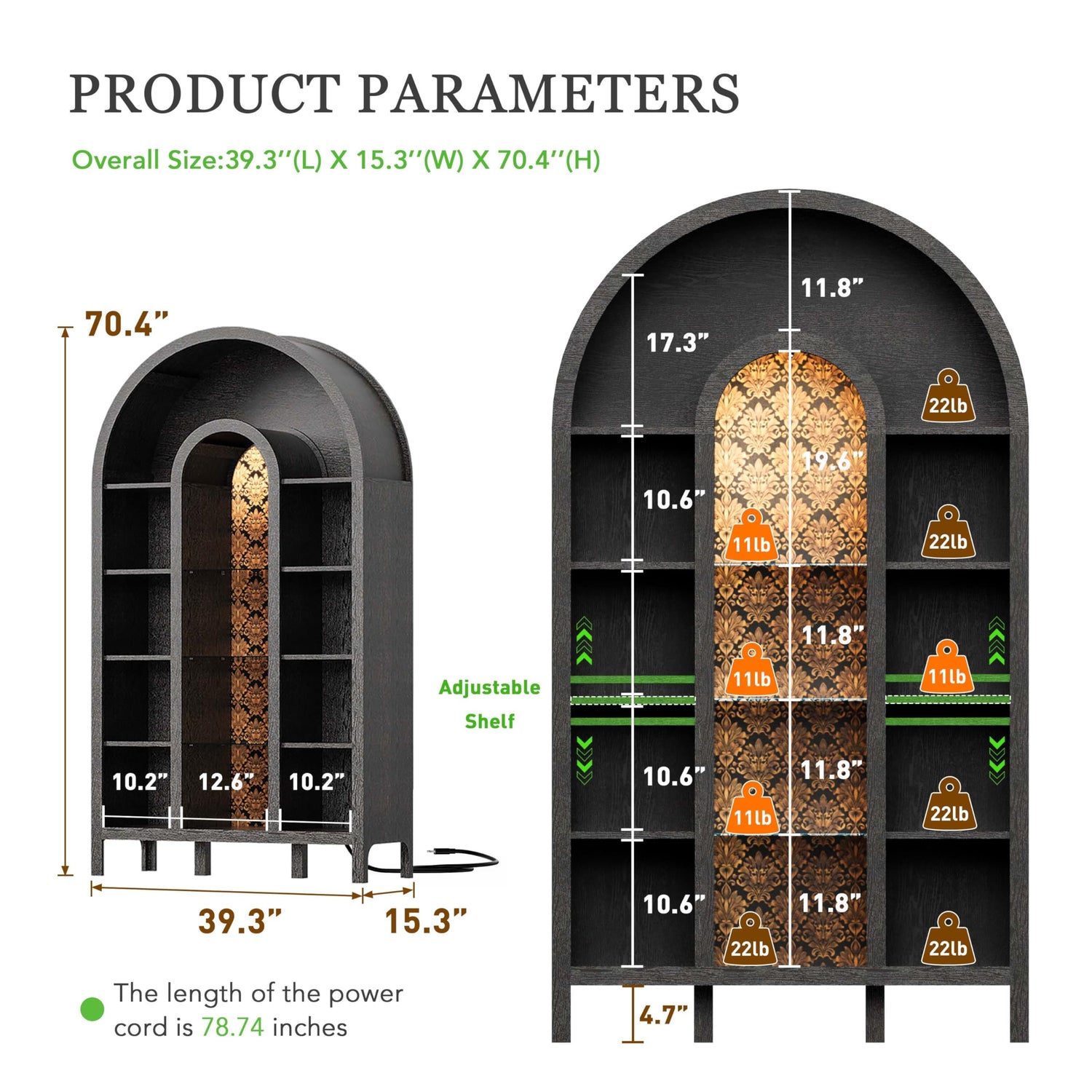 - Versatile Bookshelf & Home Bar Cabinet (70.4"H x 39.3"W x 15.3"D): This multifunctional black bookshelf doubles as an arched curio display cabinet and a home bar, seamlessly blending charm with modern practicality. With adjustable shelves, it offers ample space for books, decorative items, wine bottles, glassware, and bar tools, while also serving as a stylish kitchen pantry cabinet for additional storage, all while enhancing the aesthetic appeal of any room.