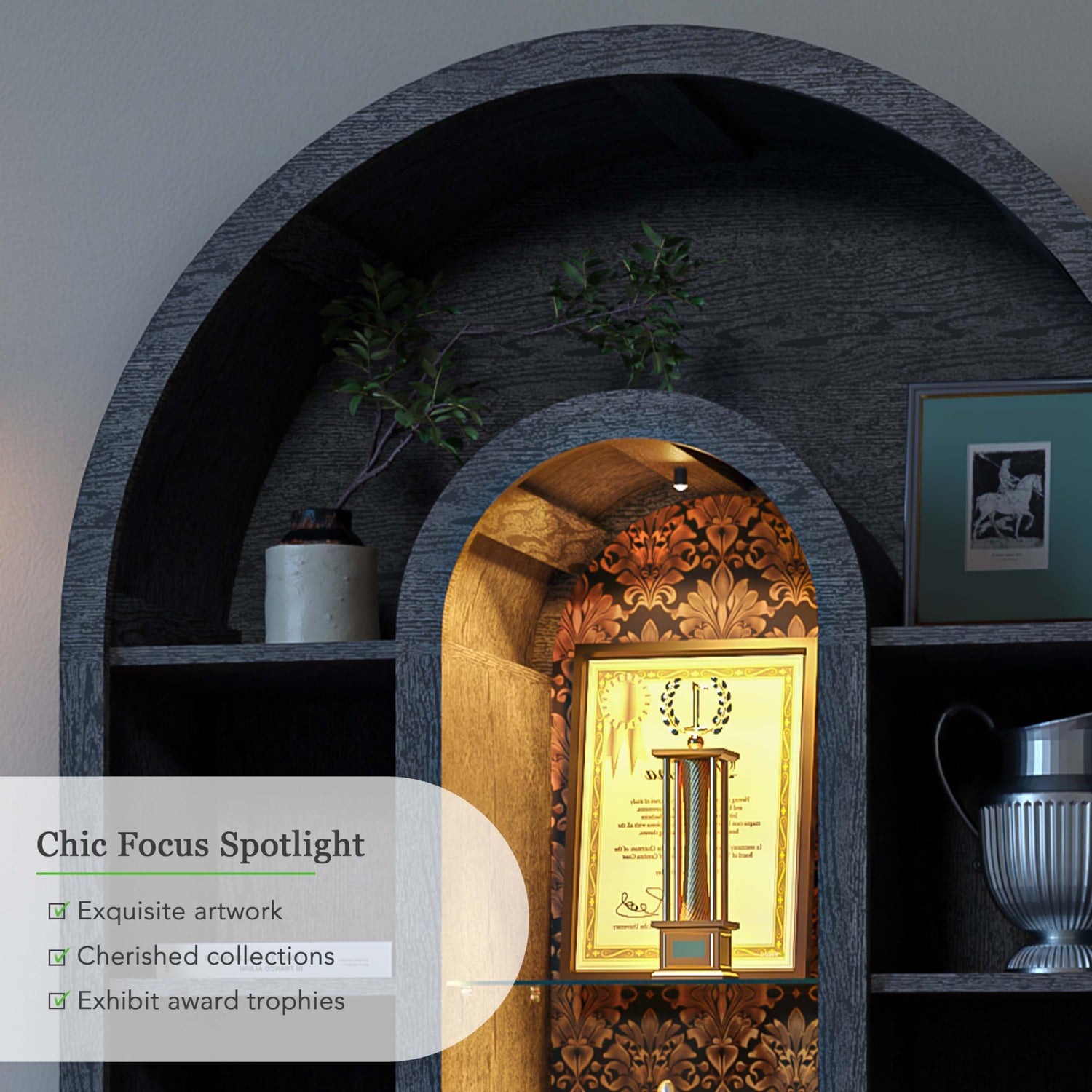 - 13 Shelf Spaces in Staggered Layout: This tall bookshelf with storage features a unique open shelving design with a top arch section, 8 storage shelves on the sides, and 4 glass display shelves in the middle. Each side also includes 1 adjustable shelf, allowing you to customize the height to suit your storage needs. This arched pantry cabinet layout beautifully showcases your favorite items, while also offering ample storage space. It’s the perfect balance between functionality and aesthetic display, making it ideal as an arched bar cabinet or food pantry cabinet.