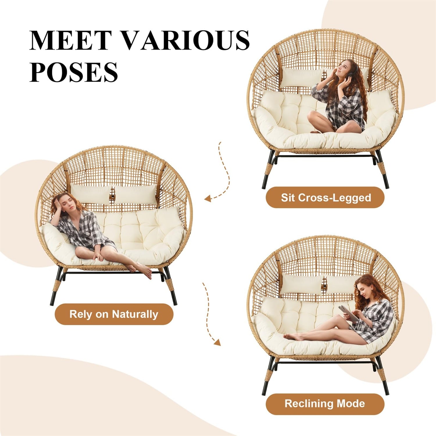 FINCATI Indoor Outdoor Double Egg Chair, 2 Person Oversized Wicker Rattan Stationary Lounge Chair with Legs, 680 lbs Loveseat Boho Egg Basket Chairs for Patio Garden Backyard Living Room Beige