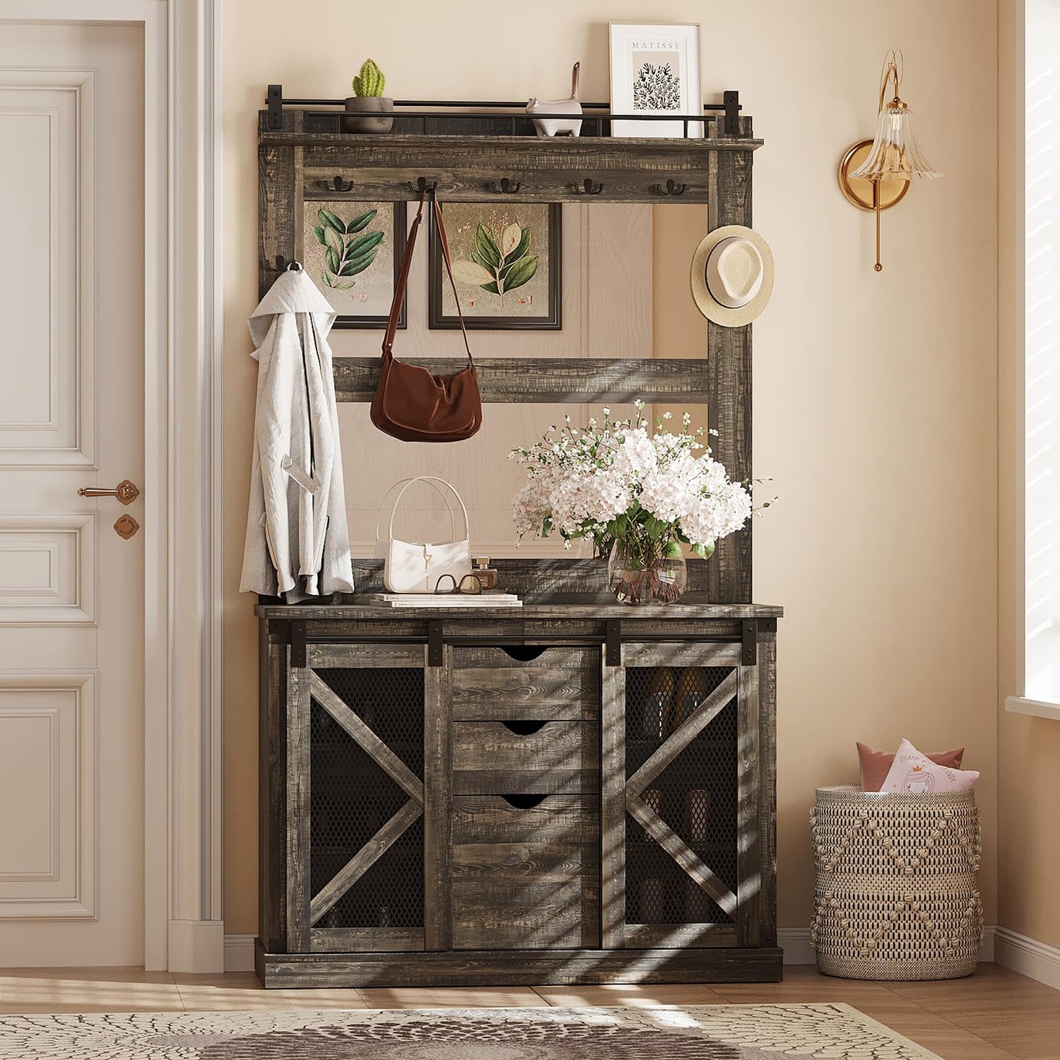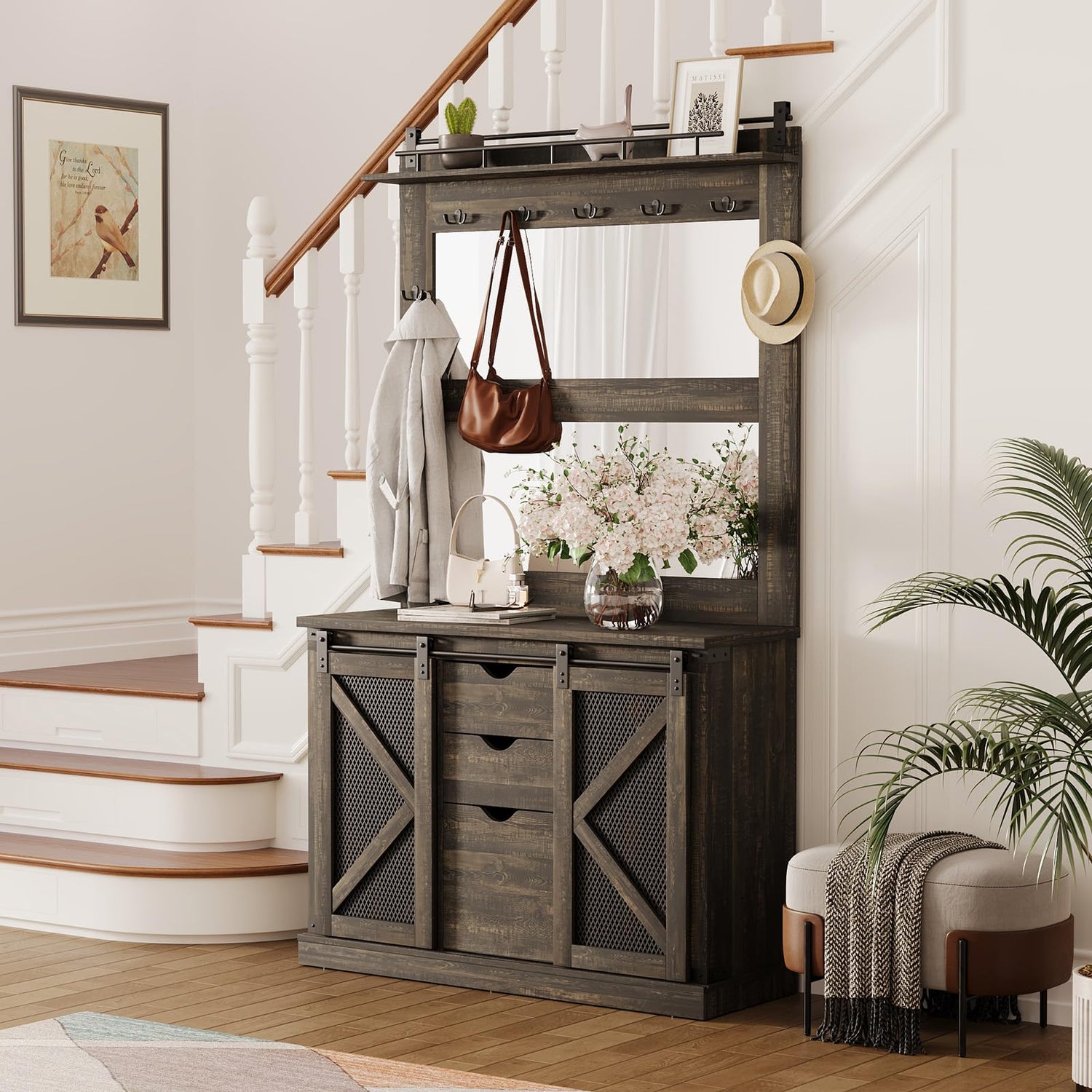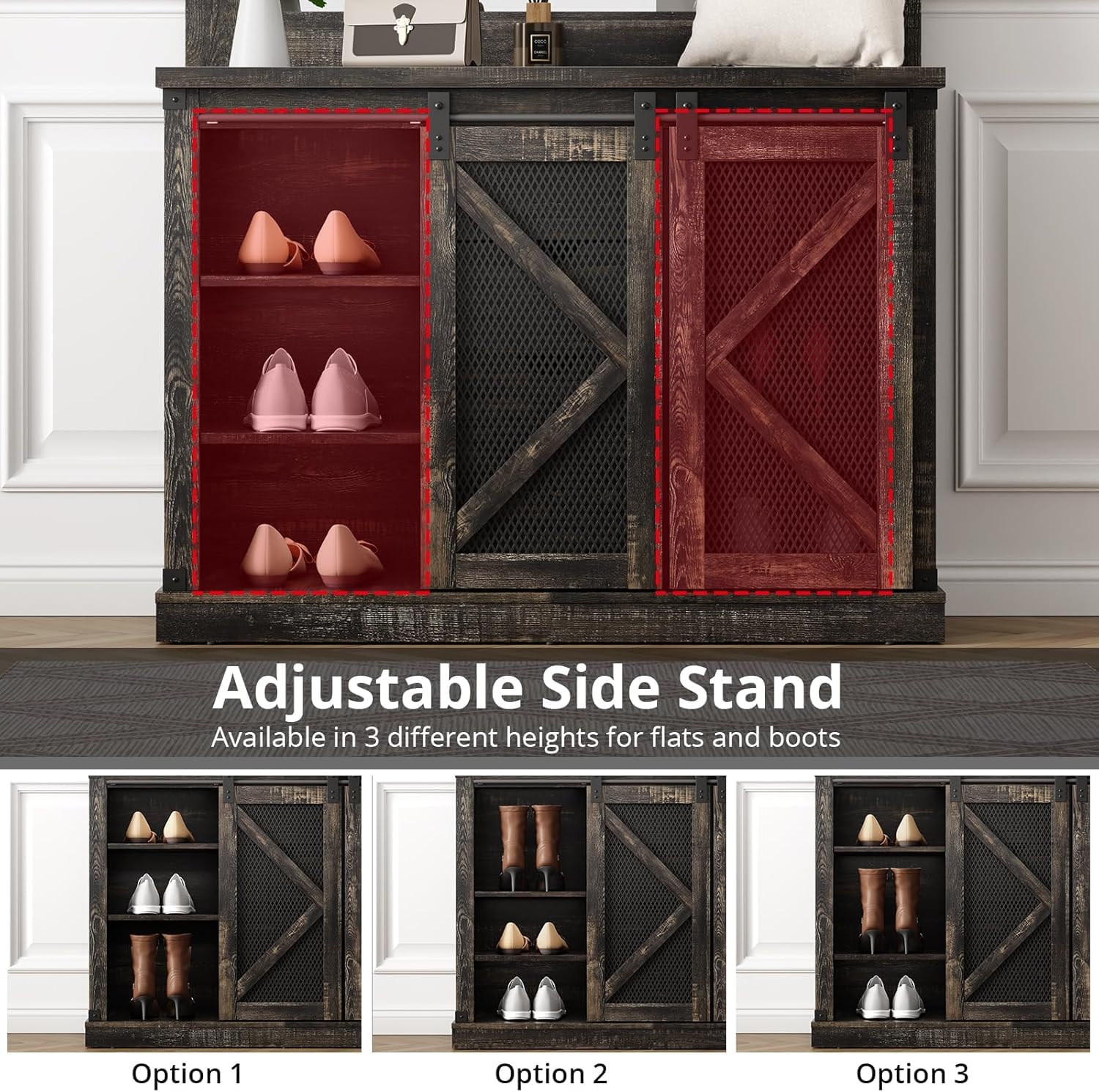 - --Stylish Organization: This coat rack features two sliding barn door shoe cabinets with adjustable shelves for organizing footwear, plus three spacious drawers for additional accessory storage, keeping your entryway stylish and clutter-free