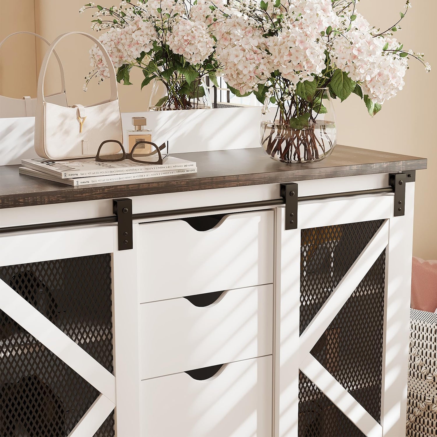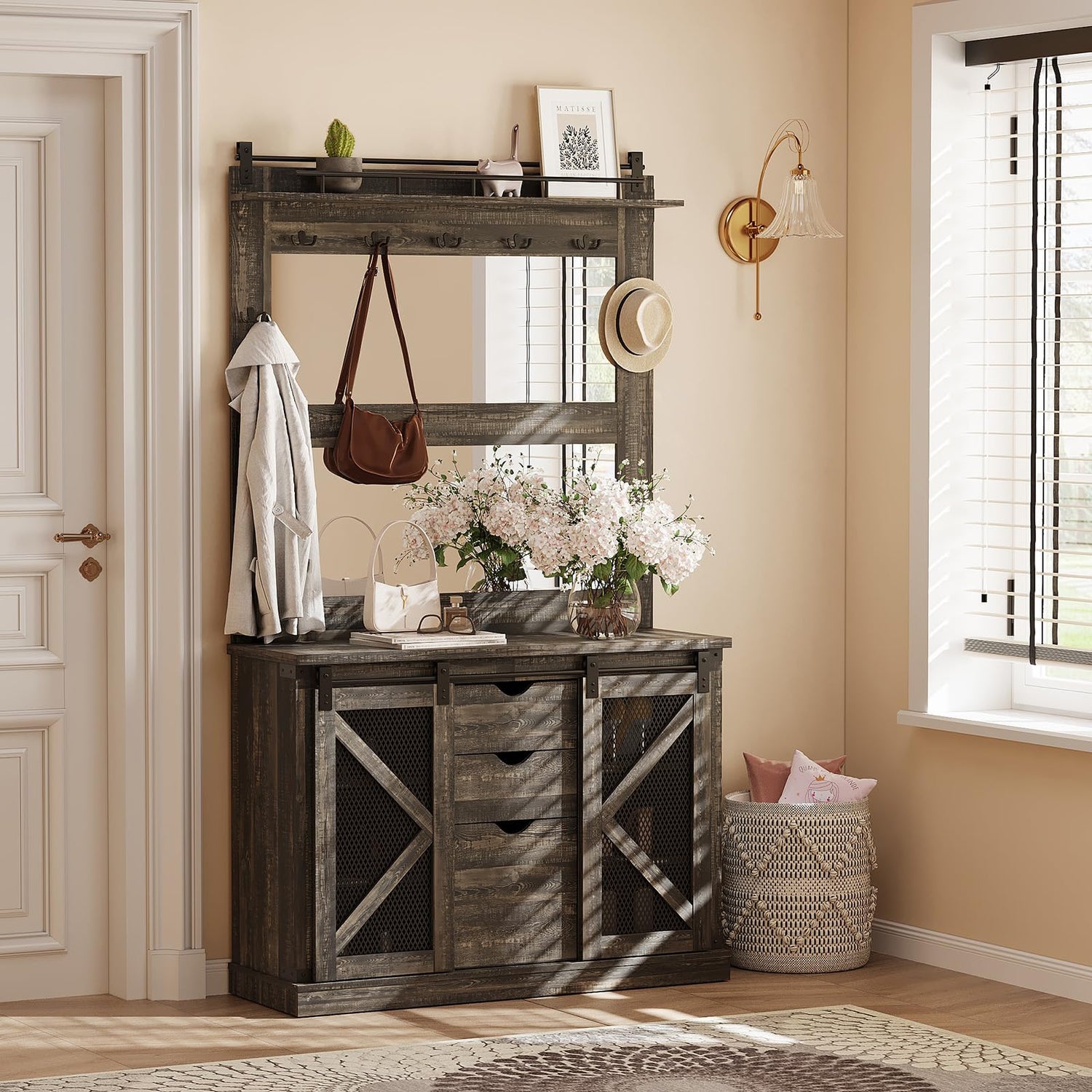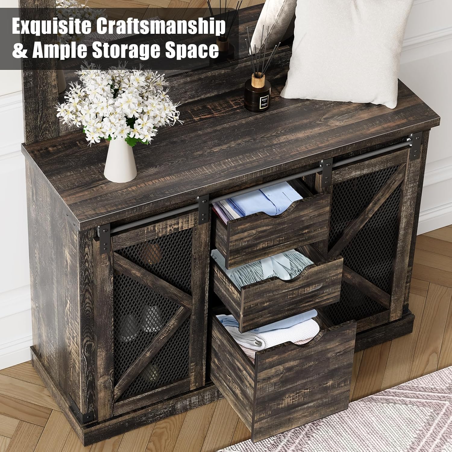 - --Stylish Organization: This coat rack features two sliding barn door shoe cabinets with adjustable shelves for organizing footwear, plus three spacious drawers for additional accessory storage, keeping your entryway stylish and clutter-free