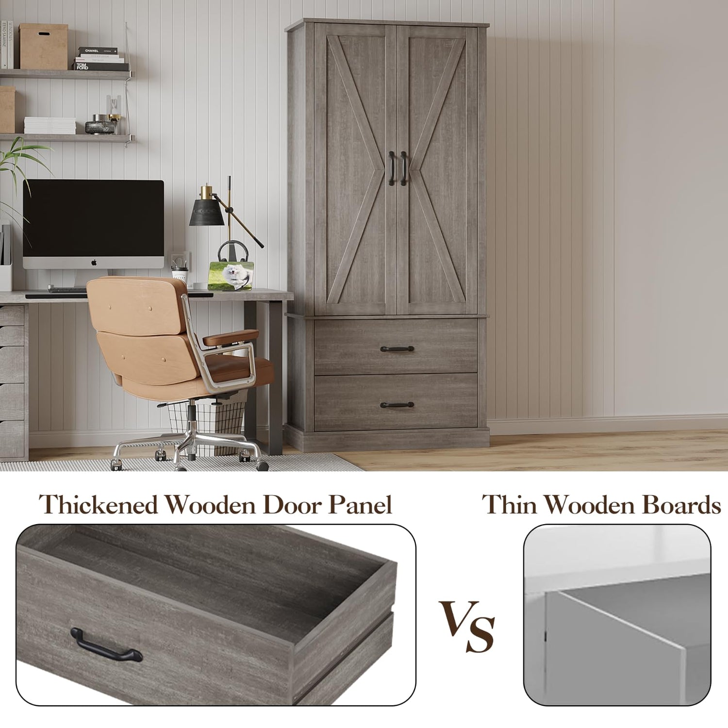 - Charming Farmhouse Aesthetic: Embrace the modern farmhouse charm of our food pantry cabinet, featuring rustic barn doors and a wood-like texture; the classic black metal flower-shaped handles add warmth and personality, creating an inviting atmosphere in your home