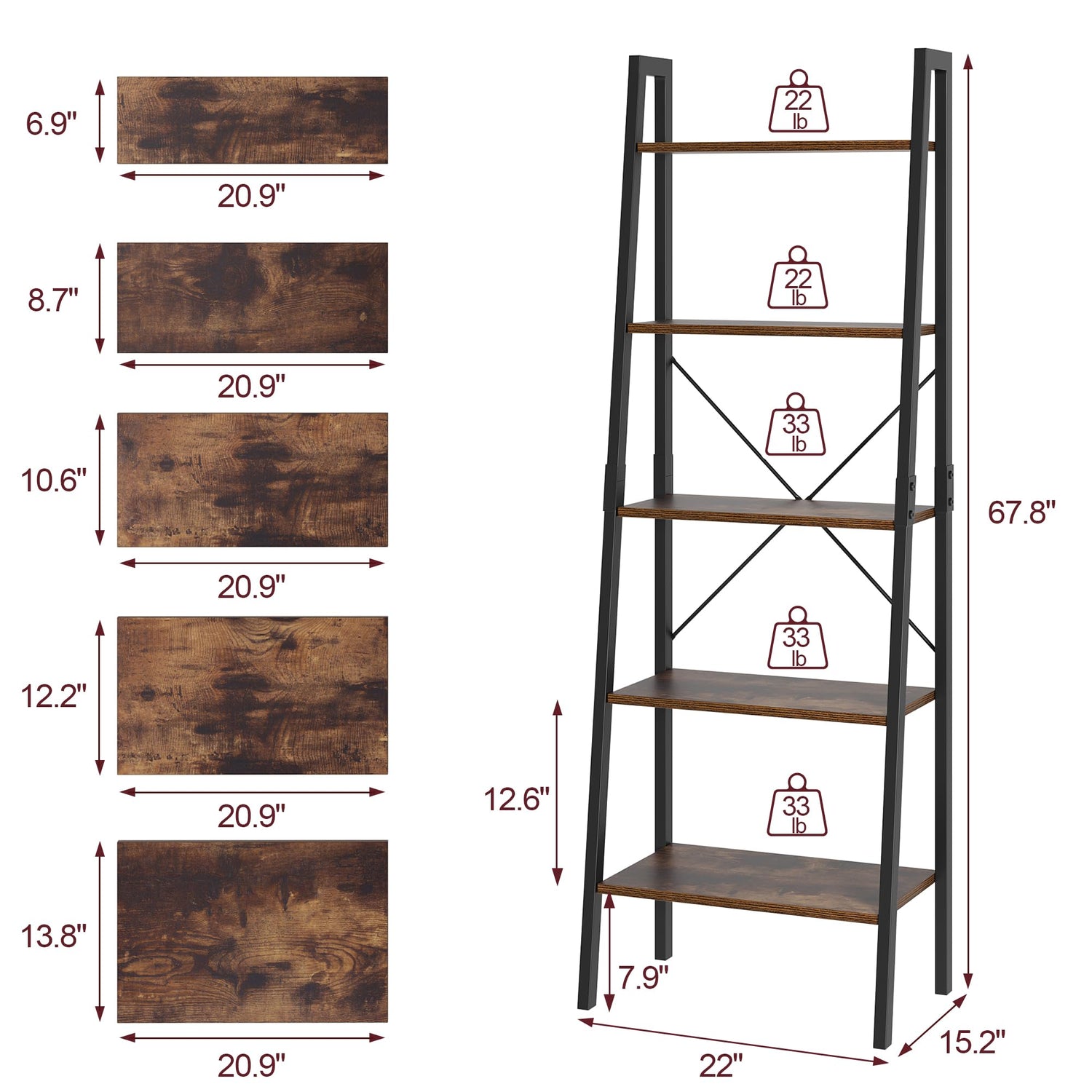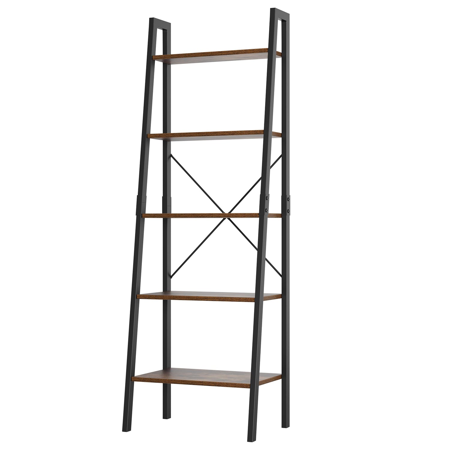 - Premium Material: Constructed from durable rustic brown woodgrain particle board and sturdy black metal frames, this ladder bookshelf can support a weight capacity of 22-33lb.