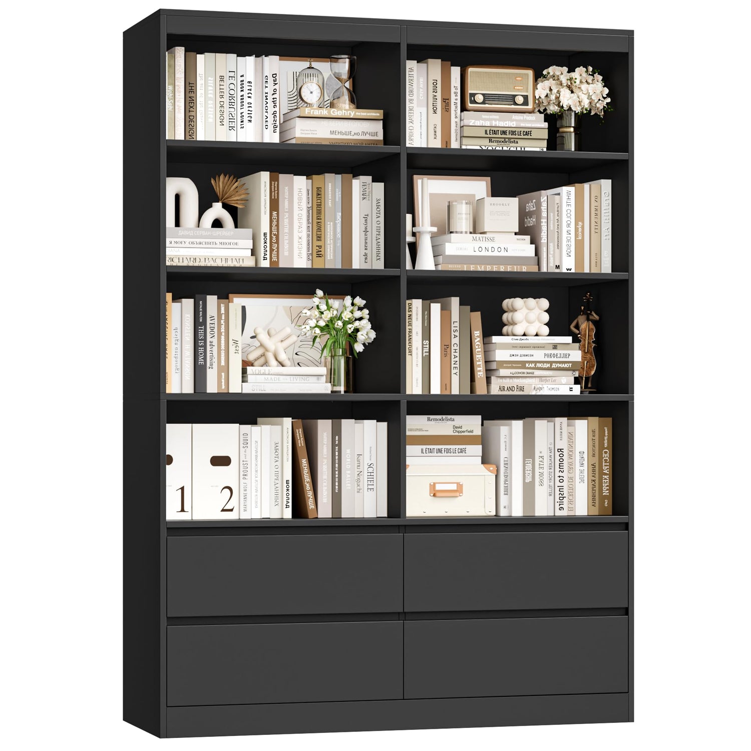 - Modern Bookshelf with Streamlined Design This sleek Black bookshelf features handle-free drawers and smooth surfaces for effortless cleaning. The minimalist bookcase protects against bumps while complementing contemporary decor. A practical bookshelf with drawers that balances form and function.