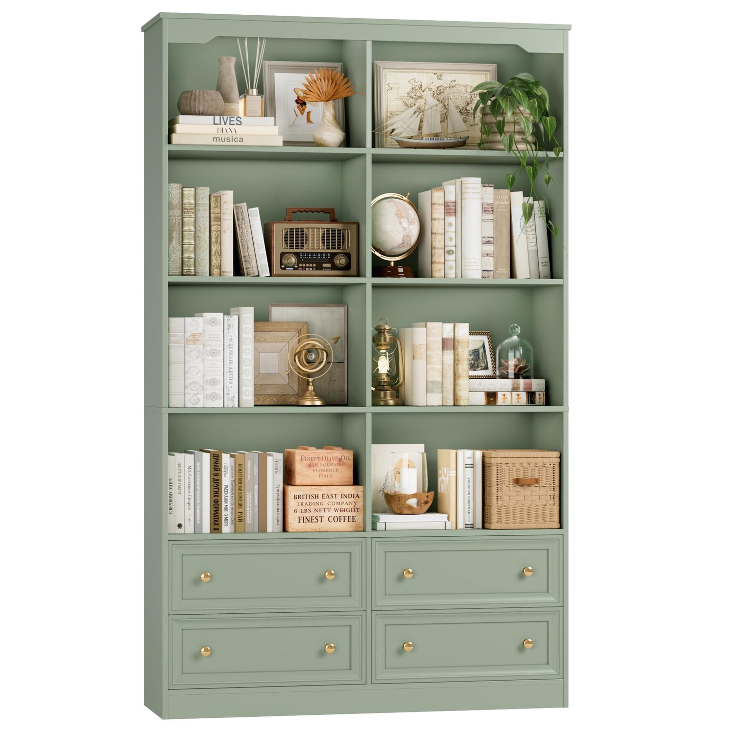 - 【Double Wide, Powerful Storage】With 4 drawers and 8 shelves to keep your belongings organized, you'll never run out of space with this green bookshelf. Rational layout of open shelves and drawers works perfect for home display and storage. Making it easy to classify your collection of books, photo albums, delicate trinkets, etc.