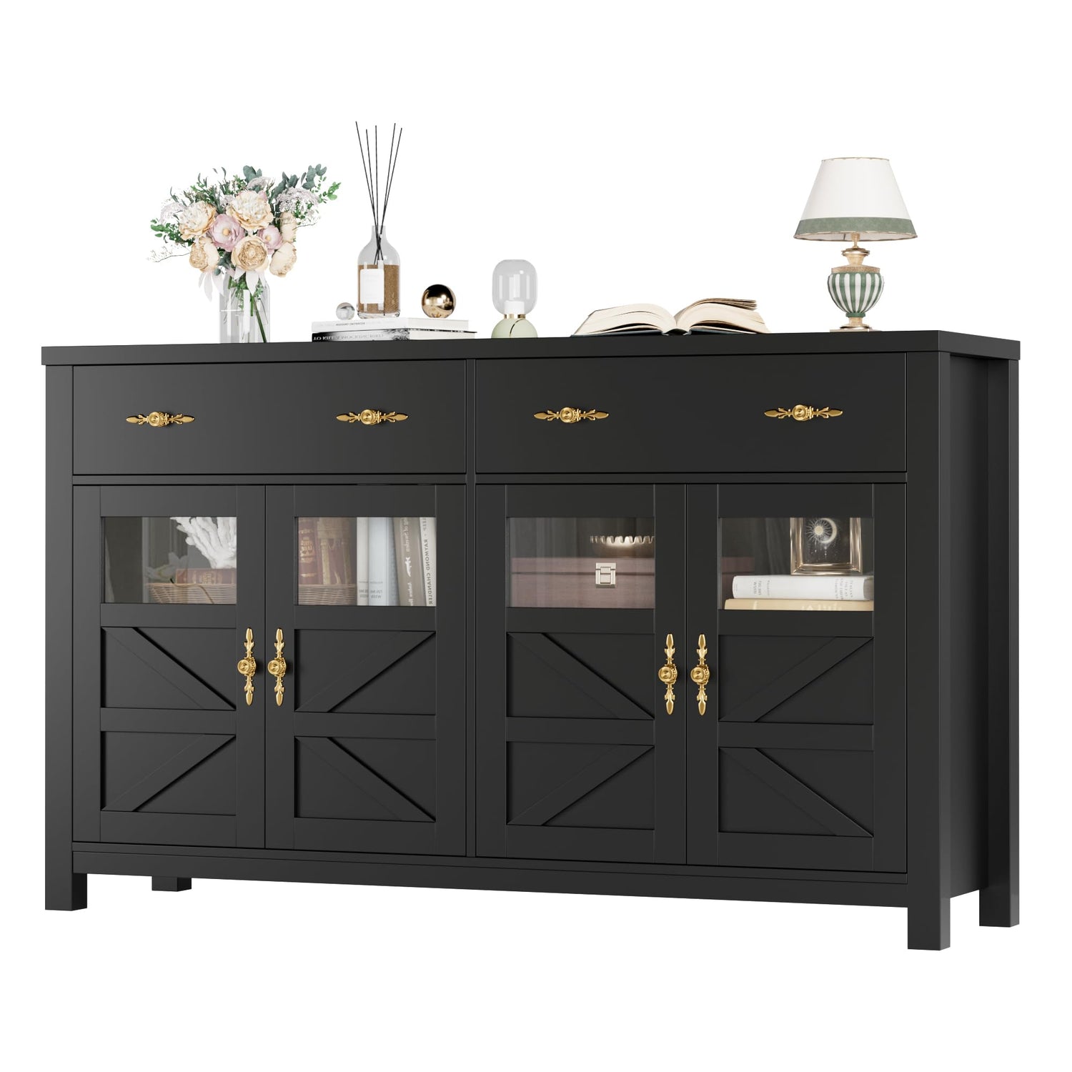 finetones Buffet Cabinet with Storage, 55.1" Large Sideboard Buffet Cabinet, Farmhouse Sideboard Kitchen Cabinet with 2 Drawers and 4 Doors, Wood Coffee Bar Cabinet Buffet Table for Kitchen, Black