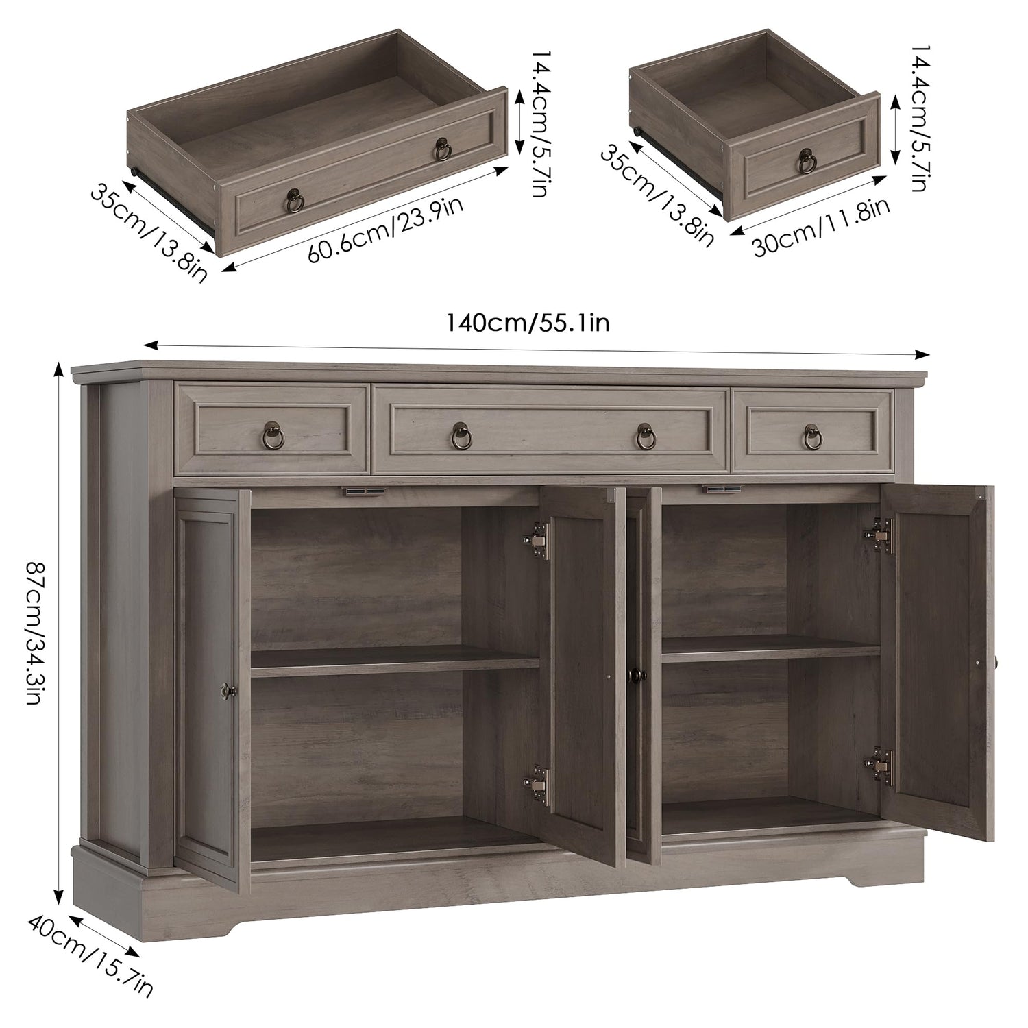 - 【More Than a Kitchen Cabinet】The buffet cabinet with storage has a wide 55.1-inch tabletop, perfect for placing your coffee maker and microwave oven, while three drawers and two double-door cabinets can easily accommodate all your daily kitchen utensils and keep your kitchen and dining room clean and tidy. To meet different storage needs, our buffet cabinet has been thoughtfully designed with a large drawer and 2 small drawers. The shelves inside the right cabinet can be adjusted to 3 different heights according to the size of the items you want to store. Hide the clutter, create more space, and get cooking.