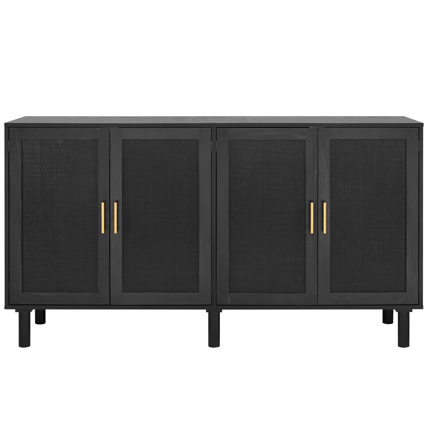 Finnhomy 4 Door Sideboard Buffet Cabinet, Kitchen Storage Cabinet with Black Painted Rattan Decorated Doors, Cupboard Console Table, Boho Accent Liquor Cabinet, 62.3X 15.7X 34.6 Inches, Full Black