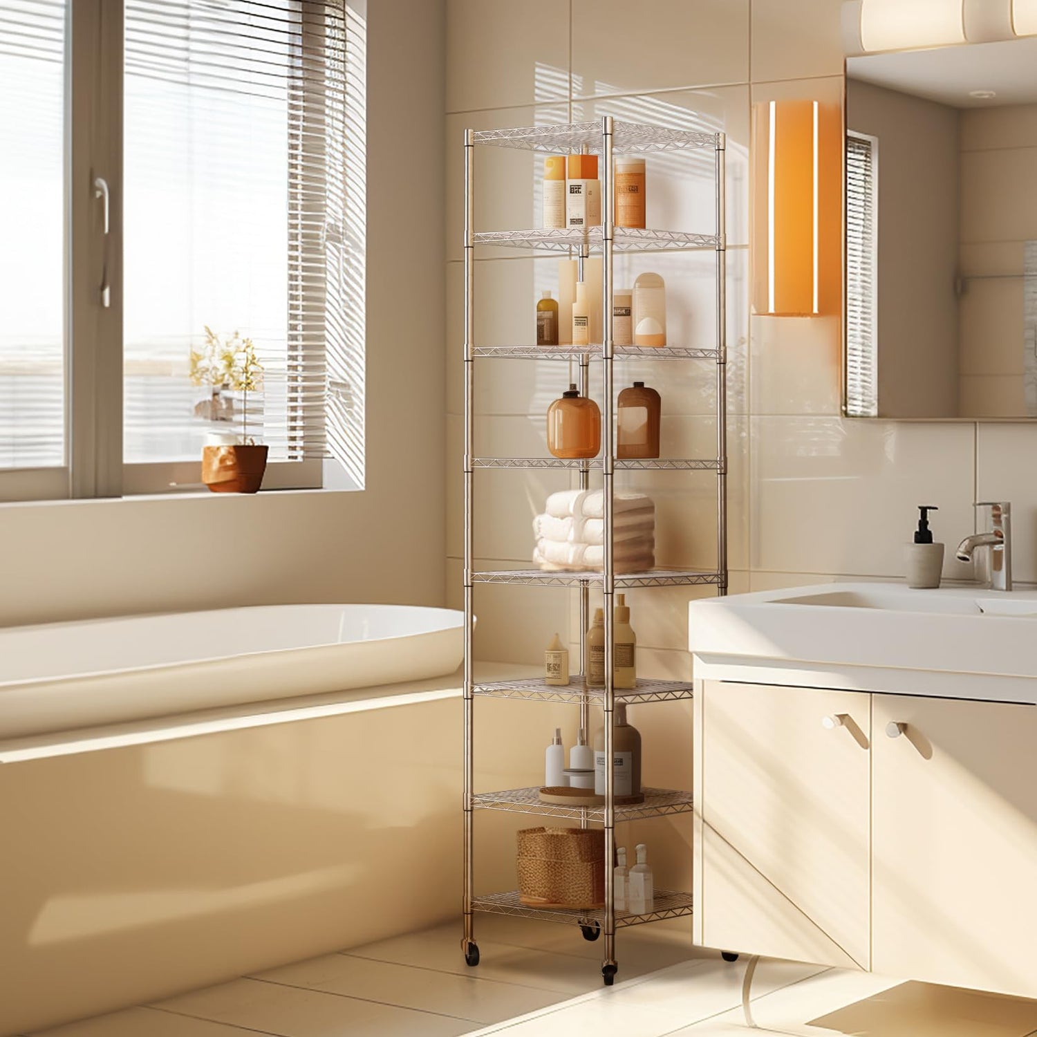 - UPDATE & OPTIMIZE - This is our 3rd generation products,we combined the needs of various customers to launch this generation products. It have 72.8 inches tall and 8 shelves which create a lot of extra storage space in kitchen, office, garage, bathroom and more. We also matched this shelving unit with 4 slient wheels to help you easily move in your room.