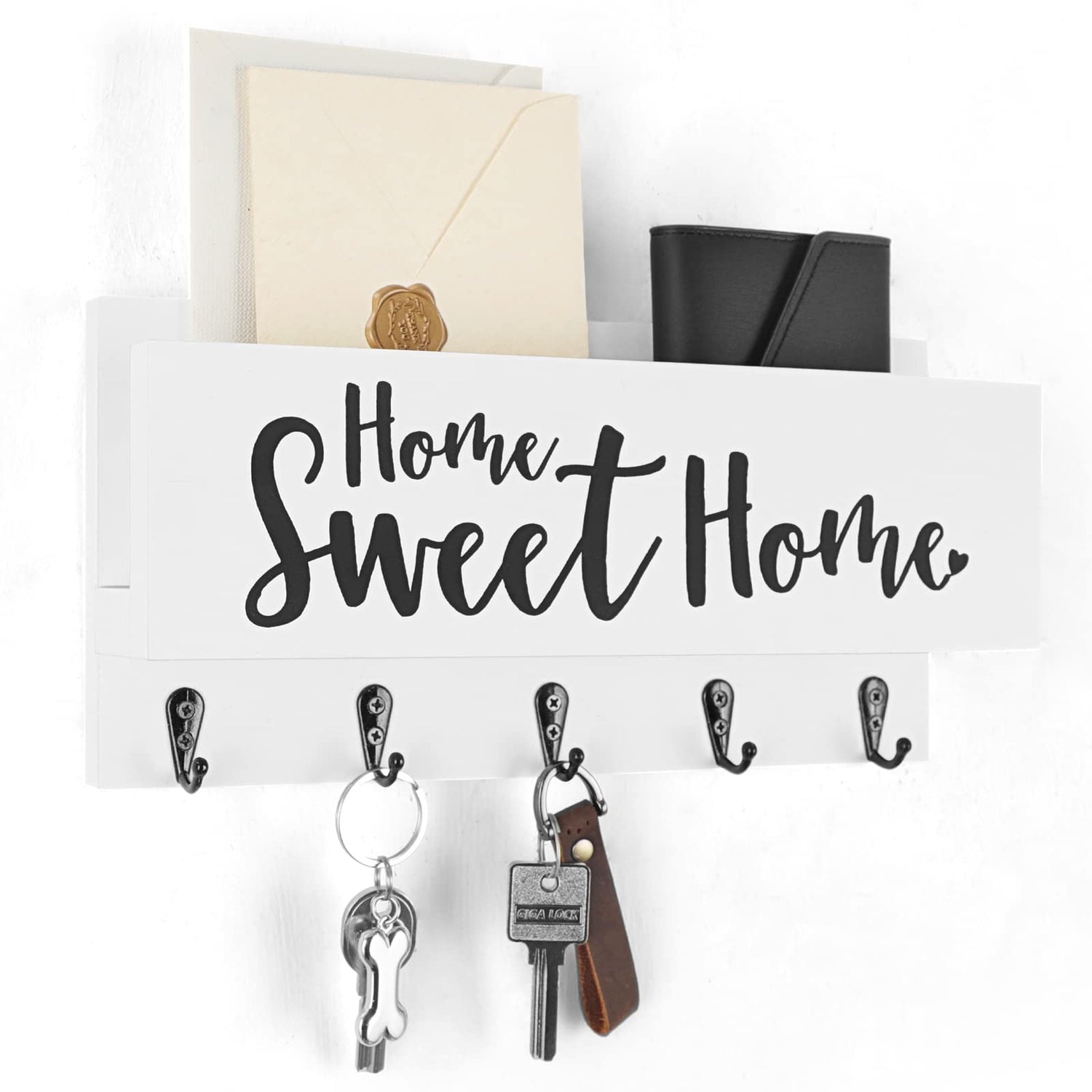 - WARM AND WELCOMING entryway wall organizer invites guests to hang-up their scarves and keys and stay a while. This 11.8” x 5.9” x 3.2” key-and-mail-holder-for-wall has space for multiple visitors.