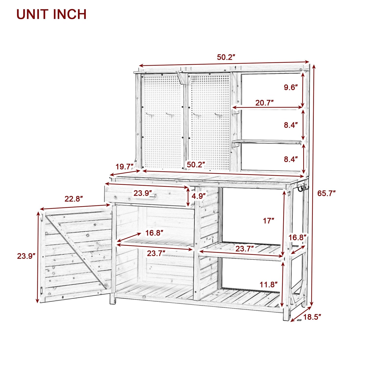 Fir Wood Potting Bench with Hutch - Outdoor Garden Workstation with 4 Shelves, Drawer & Adjustable Storage, 50.2" Countertop, & Pegboard (White + Wood + Rustic)